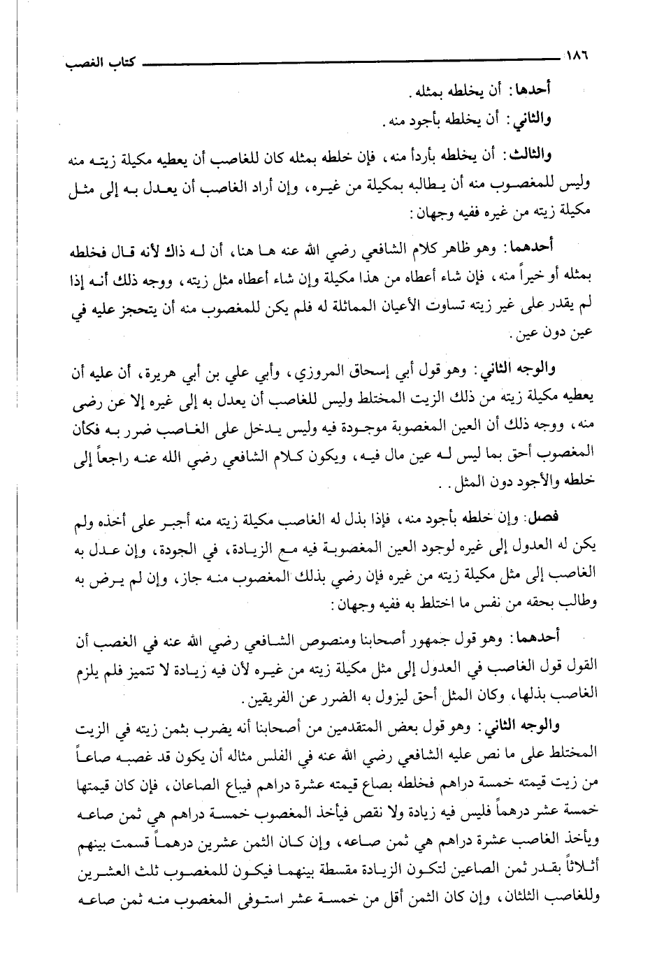 وَالثَّالِثُ: أَنْ يَخْلِطَهُ بِأَرْدَأَ مِنْهُ، فَإِنْ خَلَطَهُ بِمِثْلِهِ كَانَ لِلْغَاصِبِ أَنْ يُعْطِيَهُ مَكِيلَةَ زَيْتِهِ مِنْهُ وَلَيْسَ لِلْمَغْصُوبِ مِنْهُ، أَنْ يُطَالِبَهُ بِمَكِيَلَةٍ مِنْ غَيْرِهِ، وَإِنْ أَرَادَ الْغَاصِبُ أَنْ يَعْدِلَ بِهِ إِلَى مِثْلِ مَكِيلَةِ زَيْتِهِ مِنْ غَيْرِهِ فَفِيهِ وَجْهَانِ: