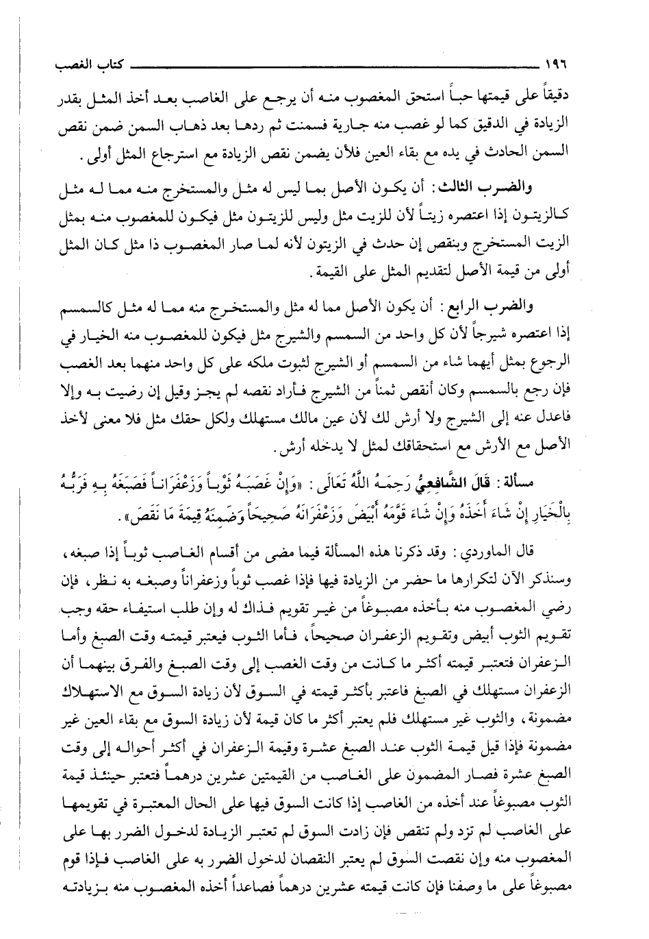 قَالَ الْمَاوَرْدِيُّ: وَقَدْ ذَكَرْنَا هَذِهِ الْمَسْأَلَةَ فِيمَا مَضَى مِنْ أَقْسَامِ الْغَاصِبِ ثَوْبًا إِذَا صَبَغَهُ، وَسَنَذْكُرُ الْآنَ لِتَكْرَارِهَا مَا حَضَرَ مِنَ الزِّيَادَةِ فِيهَا فَإِذَا غَصَبَ ثَوْبًا وَزَعْفَرَانًا وَصَبَغَهُ بِهِ نُظِرَ، فَإِنْ رَضِيَ الْمَغْصُوبُ مِنْهُ بِأَخْذِهِ مَصْبُوغًا مِنْ غَيْرِ تَقْوِيمٍ فَذَاكَ لَهُ وَإِنْ طَلَبَ اسْتِيفَاءَ حَقِّهِ وَجَبَ تَقْوِيمُ الثَّوْبِ أَبْيَضَ وَتَقْوِيمُ الزَّعْفَرَانِ صَحِيحًا، فَأَمَّا الثَّوْبُ فَيُعْتَبَرُ قِيمَتُهُ وَقْتَ الصَّبْغِ وَأَمَّا الزَّعْفَرَانُ فَتُعْتَبَرُ قِيمَتُهُ أَكْثَرَ مَا كَانَتْ مِنْ وَقْتِ الْغَصْبِ إِلَى وَقْتِ الصَّبْغِ وَالْفَرْقُ بَيْنَهُمَا أَنَّ الزَّعْفَرَانَ مُسْتَهْلَكٌ فِي الصَّبْغِ فَاعْتُبِرَ بِأَكْثَرِ قِيمَتِهِ فِي السُّوقِ لِأَنَّ زِيَادَةَ السُّوقِ مَعَ الِاسْتِهْلَاكِ مَضْمُونَةٌ، وَالثَّوْبُ غَيْرُ مُسْتَهْلَكٍ فَلَمْ يُعْتَبَرْ أَكْثَرَ مَا كَانَ قِيمَةً لِأَنَّ زِيَادَةَ السُّوقِ مَعَ بَقَاءِ الْعَيْنِ غَيْرُ مَضْمُونَةٍ فَإِذَا قِيلَ قِيمَةُ الثَّوْبِ عِنْدَ الصَّبْغِ عَشَرَةٌ وَقِيمَةُ الزَّعْفَرَانِ فِي أَكْثَرِ أَحْوَالِهِ إِلَى وَقْتِ الصَّبْغِ عَشَرَةٌ فَصَارَ الْمَضْمُونُ عَلَى الْغَاصِبِ مِنَ الْقِيمَتَيْنِ عِشْرِينَ دِرْهَمًا فَتُعْتَبَرُ حِينَئِذٍ قِيمَةُ الثَّوْبِ مَصْبُوغًا عِنْدَ أَخْذِهِ مِنَ الغاصب إذا كان السُّوقُ فِيهَا عَلَى الْحَالِ الْمُعْتَبَرَةِ فِي تَقْوِيمِهَا عَلَى الْغَاصِبِ لَمْ تَزِدْ وَلَمْ تَنْقُصْ فَإِنْ زَادَتِ السُّوقُ لَمْ تُعْتَبَرِ الزِّيَادَةُ لِدُخُولِ الضَّرَرِ بِهَا عَلَى الْمَغْصُوبِ مِنْهُ وَإِنْ نَقَصَتِ السُّوقُ لَمْ يُعْتَبَرِ النُّقْصَانَ لِدُخُولِ الضَّرَرِ بِهِ عَلَى الْغَاصِبِ فَإِذَا قُوِّمَ مَصْبُوغًا عَلَى مَا وَصَفْنَا فَإِنْ كَانَتْ قِيمَتُهُ عِشْرِينَ دِرْهَمًا فَصَاعِدًا أَخَذَهُ الْمَغْصُوبُ مِنْهُ بِزِيَادَتِهِ