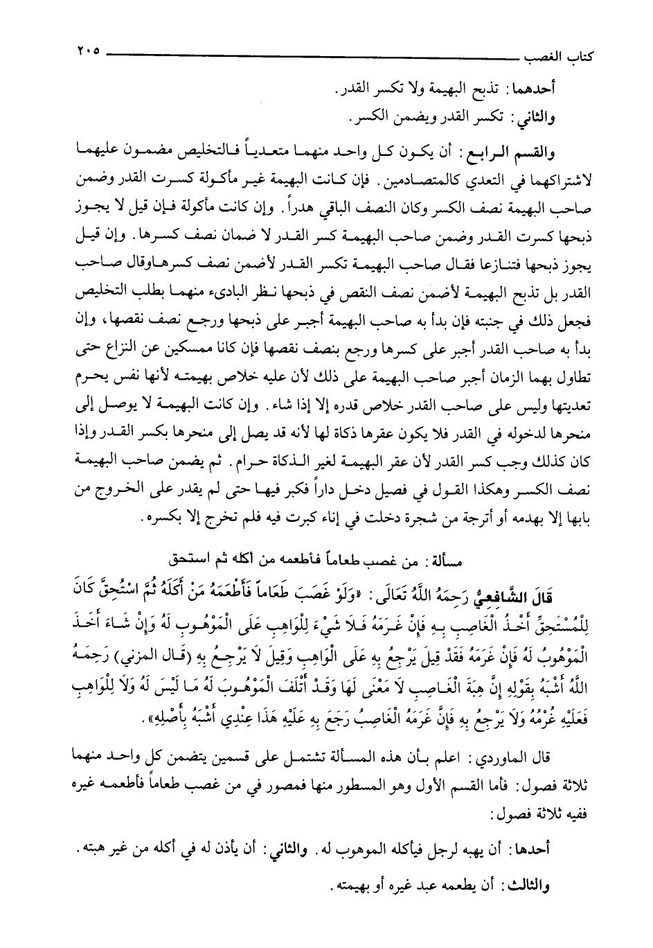 قَالَ الْمَاوَرْدِيُّ: اعْلَمْ بِأَنَّ هَذِهِ الْمَسْأَلَةَ تَشْتَمِلُ عَلَى قِسْمَيْنِ يَتَضَمَّنُ كُلُّ وَاحِدٍ مِنْهُمَا ثَلَاثَةَ فُصُولٍ: فَأَمَّا الْقِسْمُ الْأَوَّلُ وَهُوَ الْمَسْطُورُ مِنْهَا فمصور في من غَصَبَ طَعَامًا فَأَطْعَمَهُ غَيْرَهُ فَفِيهِ ثَلَاثَةُ فُصُولٍ: