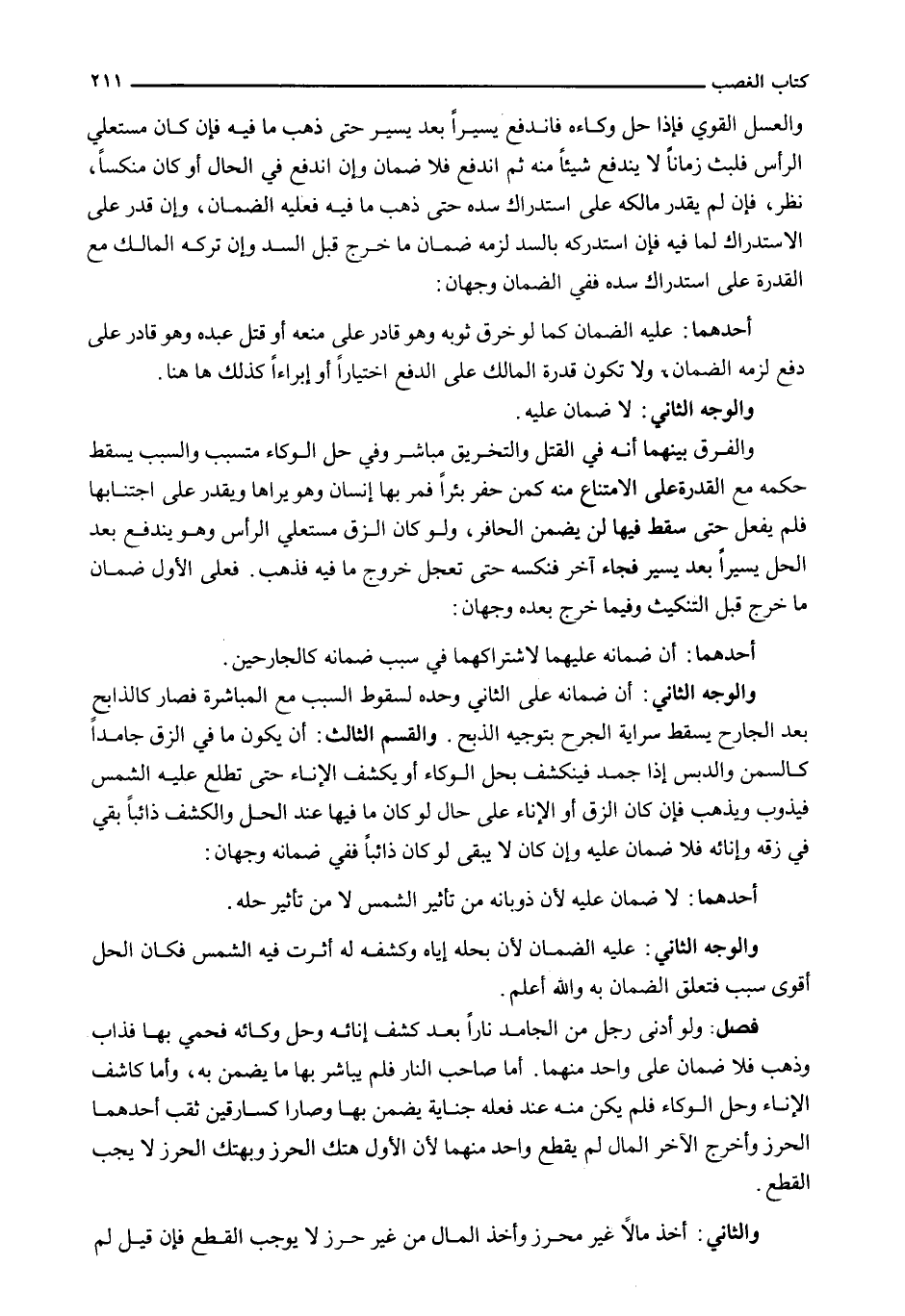 وَالْوَجْهُ الثَّانِي: أَنَّ ضَمَانَهُ عَلَى الثَّانِي وَحْدَهُ لِسُقُوطِ السَّبَبِ مَعَ الْمُبَاشَرَةِ فَصَارَ كَالذَّابِحِ بَعْدَ الْجَارِحِ يُسْقِطُ سِرَايَةَ الْجُرْحِ بِتَوْجِيهِ الذَّبْحِ. وَالْقِسْمُ الثَّالِثُ: أَنْ يَكُونَ مَا فِي الزِّقِّ جَامِدًا كَالسَّمْنِ وَالدِّبْسِ إِذَا جَمُدَ فَيَنْكَشِفَ بِحَلِّ الْوِكَاءِ أَوْ يكشف الْإِنَاءِ حَتَّى تَطْلُعَ عَلَيْهِ الشَّمْسُ فَيَذُوبُ وَيَذْهَبُ فَإِنْ كَانَ الزِّقُّ أَوِ الْإِنَاءُ عَلَى حَالٍ لَوْ كَانَ مَا فِيهَا عِنْدَ الْحَلِّ وَالْكَشْفِ ذَائِبًا بَقِيَ فِي زِقِّهِ وَإِنَائِهِ فَلَا ضَمَانَ عَلَيْهِ وَإِنْ كَانَ لَا يَبْقَى لَوْ كَانَ ذَائِبًا فَفِي ضَمَانِهِ وَجْهَانِ: