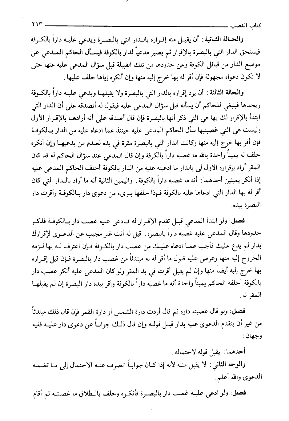 : وَلَوِ ابْتَدَأَ الْمُدَّعِي قَبْلَ تَقَدُّمِ الْإِقْرَارِ لَهُ فَادَّعَى عَلَيْهِ غَصْبَ دَارٍ بِالْكُوفَةِ فَذَكَرَ حُدُودَهَا وَقَالَ الْمُدَّعَى عَلَيْهِ غَصَبَهُ دَارًا بِالْبَصْرَةِ. قِيلَ لَهُ أَنْتَ غَيْرُ مُجِيبٍ عَنِ الدَّعْوَى لِإِقْرَارِكَ بِدَارٍ لَمْ يَدَّعِ عَلَيْكَ فَأَجِبْ عَمَّا ادَّعَاهُ عَلَيْكَ مِنْ غَصْبِ دَارٍ بِالْكُوفَةِ فَإِنِ اعْتَرَفَ لَهُ بِهَا لَزِمَهُ الْخُرُوجُ إِلَيْهِ مِنْهَا وَعُرِضَ عَلَيْهِ قَبُولُ مَا أَقَرَّ لَهُ بِهِ مُبْتَدِئًا مِنْ غَصْبِ دَارٍ بِالْبَصْرَةِ فإن قيل إِقْرَارَهُ بِهَا خَرَجَ إِلَيْهِ أَيْضًا مِنْهَا وَإِنْ لَمْ يَقْبَلْ أُقِرَّتْ فِي يَدِ الْمُقِرِّ وَلَوْ كَانَ الْمُدَّعَى عَلَيْهِ أَنْكَرَ غَصْبَ دَارٍ بِالْكُوفَةِ أَحْلَفَهُ الْحَاكِمُ يَمِينًا وَاحِدَةً أَنَّهُ مَا غَصَبَهُ دَارًا بِالْكُوفَةِ وَأَقَرَّ بِيَدِهِ دَارَ الْبَصْرَةِ إِنْ لَمْ يَقْبَلْهَا الْمُقَرُّ لَهُ.