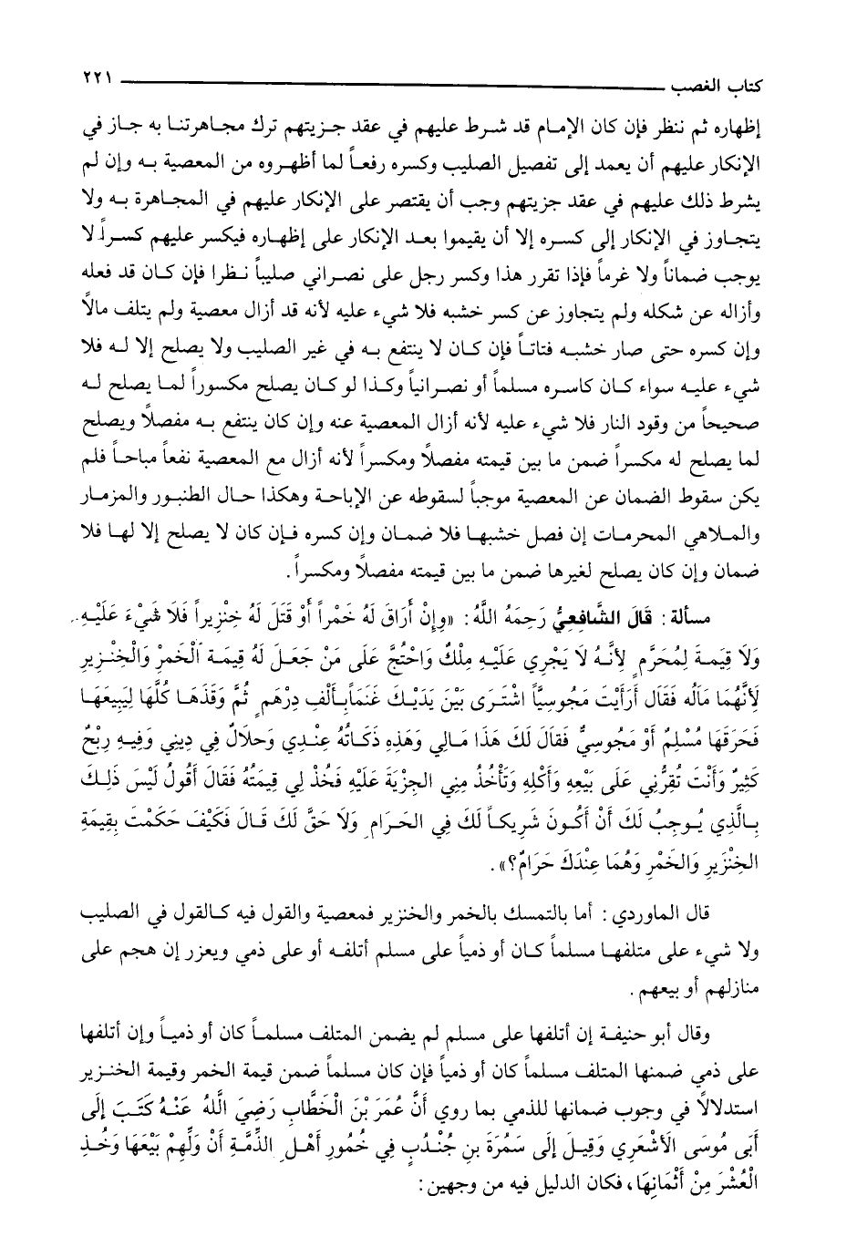 قَالَ الشَّافِعِيُّ رَحِمَهُ اللَّهُ: " وِإِنْ أَرَاقَ لَهُ خَمْرًا أَوْ قَتَلَ لَهُ خِنْزِيرًا فَلَا شَيْءَ عَلَيْهِ وَلَا قِيمَةَ لِمُحَرَّمٍ لِأَنَّهُ لَا يَجْرِي عليه ملك واحتج على من جعل له قيمة الخمر والخنزير لأنهما ماله فقال أرأيت مجوسياً اشترى بين يديك غنماً بألف درهمٍ ثم وقذها كلها ليبيعها فحرقها مسلمٌ أو مجوسيٌّ فقال لك هذا مالي وهذه ذكاته عندي وحلالٌ في ديني وفيه ربحٌ كثيرٌ وأنت تقرني على بيعه وأكله وتأخذ مني الجزية عليه فخذ لي قيمته فقال أقول ليس ذلك بالذي يوجب لك أن أكون شريكاً لك في الحرام ولا حق لك قال فكيف حكمت بقيمة الخنزير والخمر وهما عندك حرامٌ؟ ".