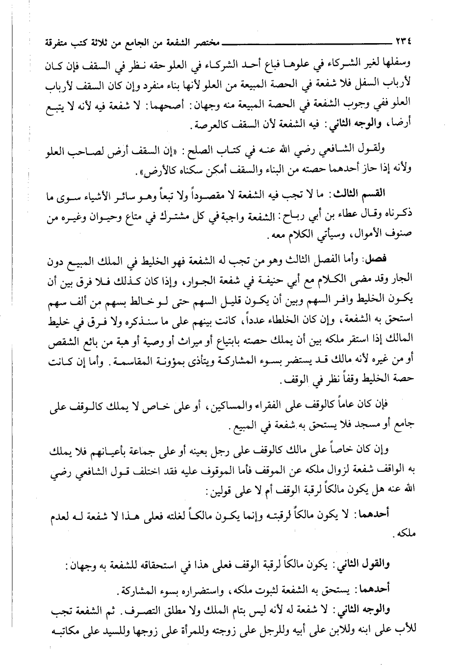 : وَأَمَّا الْفَصْلُ الثَّالِثُ وَهُوَ مَنْ تَجِبُ لَهُ الشُّفْعَةُ فَهُوَ الْخَلِيطُ فِي الْمِلْكِ الْمَبِيعِ دُونَ الْجَارِ وَقَدْ مَضَى الْكَلَامُ مَعَ أَبِي حَنِيفَةَ فِي شُفْعَةِ الْجِوَارِ، وَإِذَا كَانَ كَذَلِكَ فَلَا فَرْقَ بَيْنَ أَنْ يَكُونَ الْخَلِيطُ وَافِرَ السَّهْمِ وَبَيْنَ أَنْ يَكُونَ قَلِيلَ السَّهْمِ حَتَّى لَوْ خَالَطَ بِسَهْمٍ مِنْ أَلْفِ سَهْمٍ اسْتَحَقَّ بِهِ الشُّفْعَةَ، وَإِنْ كَانَ الْخُلَطَاءُ عَدَدًا، كَانَتْ بَيْنَهُمْ عَلَى مَا سَنَذْكُرُهُ وَلَا فَرْقَ فِي خَلِيطِ الْمَالِكِ إِذَا اسْتَقَرَّ مِلْكُهُ بَيْنَ أَنْ يَمْلِكَ حِصَّتَهُ بِابْتِيَاعٍ أَوْ مِيرَاثٍ أَوْ وَصِيَّةٍ أَوْ هِبَةٍ مِنْ بَائِعِ الشِّقْصِ أَوْ مِنْ غَيْرِهِ لِأَنَّهُ مالك قد يستضر بسوء المشاركة ويتأذى بمؤونة الْمُقَاسَمَةِ. وَأَمَّا إِنْ كَانَتْ حِصَّةُ الْخَلِيطِ وَقْفًا نُظِرَ فِي الْوَقْفِ.