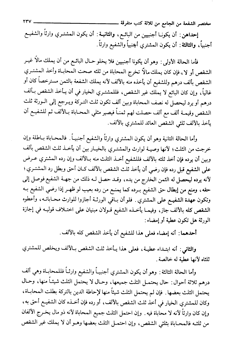 إحداهن: أَنْ يَكُونَا أَجْنَبِيَّيْنِ مِنَ الْبَائِعِ، وَالثَّانِيَةُ: أَنْ يَكُونَ الْمُشْتَرِي وَارِثًا وَالشَّفِيعُ أَجْنَبِيًّا، وَالثَّالِثَةُ: أَنْ يكون المشتري أجنبياً والشفيع وارثاً.