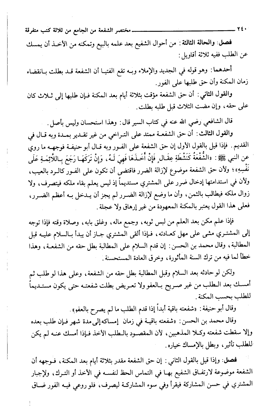 وَالْقَوْلُ الثَّالِثُ: أَنَّ حَقَّ الشُّفْعَةِ مُمْتَدٌّ عَلَى التَّرَاخِي مِنْ غَيْرِ تَقْدِيرٍ بِمُدَّةٍ وَبِهِ قَالَ فِي الْقَدِيمِ. فَإِذَا قِيلَ بِالْقَوْلِ الْأَوَّلِ إِنَّ حَقَّ الشُّفْعَةِ عَلَى الْفَوْرِ وَبِهِ قَالَ أبو حنيفة فَوَجْهُهُ مَا رُوِيَ عَنِ النَّبِيِّ - صَلَّى اللَّهُ عَلَيْهِ وَسَلَّم َ -: " الشُّفْعَةُ كَنَشْطَةِ عقالٍ فَإِنْ أَخَذَهَا فَهِيَ لَهُ، وَإِنْ تَرَكَهَا رَجَعَ بِاللَّائِمَةِ عَلَى نَفْسِهِ "؛ وَلِأَنَّ حَقَّ الشُّفْعَةِ مَوْضُوعٌ لِإِزَالَةِ الضَّرَرِ فَاقْتَضَى أَنْ تَكُونَ عَلَى الْفَوْرِ كَالرَّدِّ بِالْعَيْبِ، وَلِأَنَّ فِي اسْتَدَامَتْهَا إِدْخَالَ ضَرَرٍ عَلَى الْمُشْتَرِي مُسْتَدِيمًا إِذْ لَيْسَ يَعْلَمُ بَقَاءَ مِلْكِهِ فَيَتَصَرَّفَ، وَلَا زَوَالَ مِلْكِهِ فَيُطَالِبَ بِالثَّمَنِ، وَأَنَّ مَا وُضِعَ لِإِزَالَةِ الضرر لم يجز أن يدخ بِهِ أَعْظَمُ الضَّرَرِ، فَعَلَى هَذَا الْقَوْلِ يُعْتَبَرُ بِالْمَكِنَةِ الْمَعْهُودَةِ مِنْ غَيْرِ إِرْهَاقٍ وَلَا عَجَلَةٍ.