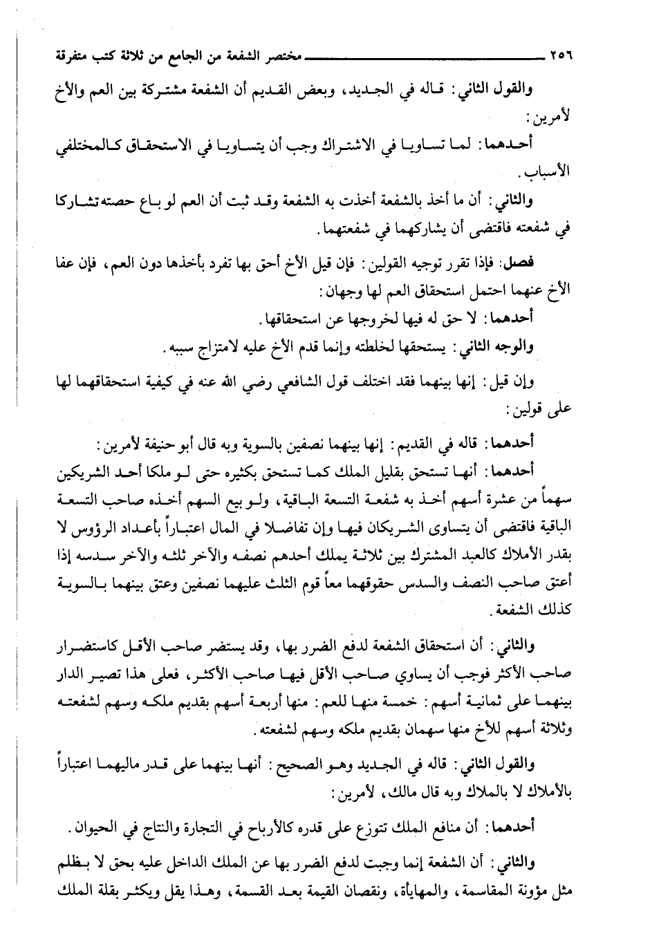 وَالثَّانِي: أَنَّ اسْتِحْقَاقَ الشُّفْعَةِ لِدَفْعِ الضَّرَرِ بِهَا، وَقَدْ يَسْتَضِرُّ صَاحِبُ الْأَقَلِّ كَاسْتِضْرَارِ صَاحِبِ الْأَكْثَرِ فَوَجَبَ أَنْ يُسَاوِيَ صَاحِبُ الْأَقَلِّ فِيهَا صَاحِبَ الْأَكْثَرِ، فَعَلَى هَذَا تَصِيرُ الدَّارُ بَيْنَهُمَا على ثمانية أسهم: خمسة منها للعم: منا أَرْبَعَةُ أَسْهُمٍ بِقَدِيمِ مِلْكِهِ وَسَهْمٌ لِشُفْعَتِهِ وَثَلَاثَةُ أَسْهُمٍ لِلْأَخِ مِنْهَا سَهْمَانِ بِقَدِيمِ مِلْكِهِ وَسَهْمٌ لِشُفْعَتِهِ.