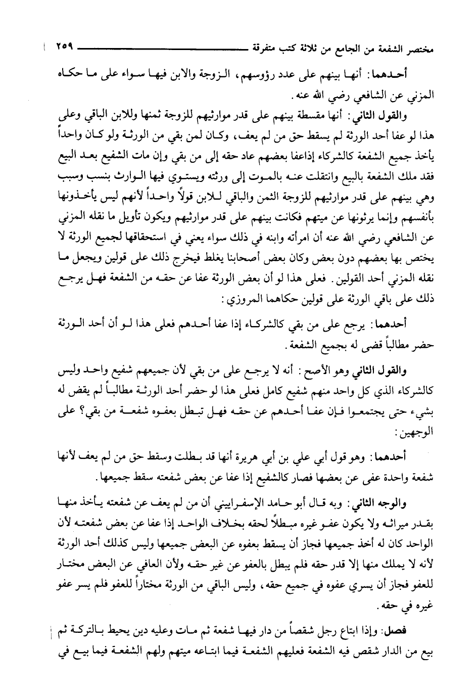 وَالْقَوْلُ الثاني: أنها مقسطة بينهم على قدر موارثيهم لِلزَّوْجَةِ ثُمُنُهَا وَلِلِابْنِ الْبَاقِي وَعَلَى هَذَا لَوْ عَفَا أَحَدُ الْوَرَثَةِ لَمْ يَسْقُطْ حَقُّ مَنْ لَمْ يَعْفُ، وَكَانَ لِمَنْ بَقِيَ مِنَ الْوَرَثَةِ وَلَوْ كَانَ وَاحِدًا يَأْخُذُ جَمِيعَ الشُّفْعَةِ كَالشُّرَكَاءِ إِذَا عَفَا بَعْضُهُمْ عَادَ حَقُّهُ إِلَى مَنْ بَقِيَ وَإِنْ مَاتَ الشَّفِيعُ بَعْدَ الْبَيْعِ فَقَدْ مَلَكَ الشُّفْعَةَ بِالْبَيْعِ وَانْتَقَلَتْ عَنْهُ بِالْمَوْتِ إِلَى وَرَثَتِهِ وَيَسْتَوِي فِيهَا الْوَارِثُ بِنَسَبٍ وَسَبَبٍ وَهِيَ بينهم على قدر موارثيهم لِلزَّوْجَةِ الثُّمُنُ وَالْبَاقِي لِلِابْنِ قَوْلًا وَاحِدًا لِأَنَّهُمْ لَيْسَ يَأْخُذُونَهَا بِأَنْفُسِهِمْ وَإِنَّمَا يَرِثُونَهَا عَنْ مَيِّتِهِمْ فكانت بينهم على قدر موارثيهم وَيَكُونُ تَأْوِيلُ مَا نَقَلَهُ الْمُزَنِيُّ عَنِ الشَّافِعِيِّ رَضِيَ اللَّهُ عَنْهُ أَنَّ امْرَأَتَهُ وَابْنَهُ فِي ذَلِكَ سَوَاءٌ يَعْنِي فِي اسْتِحْقَاقِهَا لِجَمِيعِ الْوَرَثَةِ لَا يَخْتَصُّ بِهَا بَعْضُهُمْ دُونَ بَعْضٍ وَكَانَ بَعْضُ أَصْحَابِنَا يَغْلَطُ فَيُخَرِّجُ ذَلِكَ عَلَى قَوْلَيْنِ وَيُجْعَلُ مَا نَقَلَهُ الْمُزَنِيُّ أَحَدَ الْقَوْلَيْنِ. فَعَلَى هَذَا لَوْ أَنَّ بَعْضَ الْوَرَثَةِ عَفَا عَنْ حَقِّهِ مِنَ الشُّفْعَةِ فَهَلْ يَرْجِعُ ذَلِكَ عَلَى بَاقِي الْوَرَثَةِ عَلَى قَوْلَيْنِ حَكَاهُمَا الْمَرْوَزِيُّ: