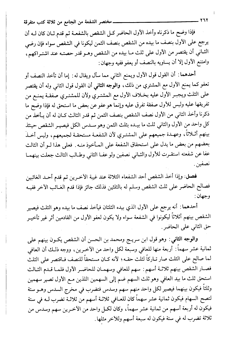 وَالْوَجْهُ الثَّانِي: وَهُوَ قَوْلُ ابْنِ سُرَيْجٍ ومحمد بن الحسن إِنَّ الشِّقْصَ يَكُونُ بَيْنَهُمْ عَلَى ثَمَانِيَةَ عَشَرَ سَهْمًا: أَرْبَعَةٌ مِنْهَا لِلْعَافِي وَسَبْعَةٌ لِكُلِّ وَاحِدٍ مِنَ الْآخَرَيْنِ وَوَجْهُ ذَلِكَ أَنَّ الْعَافِيَ لَمَّا صَالَحَ عَلَى الثُّلُثِ صَارَ تَارِكًا لِثُلُثِ حَقِّهِ؛ لِأَنَّهُ كَانَ مُسْتَحِقًّا لِلنِّصْفِ فَاقْتَصَرَ عَلَى الثُّلُثِ فَصَارَ الشِّقْصُ بَيْنَهُمْ ثَلَاثَةَ أَسْهُمٍ: سَهْمٌ لِلْعَافِي وَسَهْمَانِ لِلْحَاضِرِ الْأَوَّلِ فَلَمَّا قَدِمَ الثَّالِثُ اسْتَحَقَّ ثُلُثَ مَا بِيَدِ الْعَافِي وَهُوَ ثُلُثُ السَّهْمِ ضُمَّ إِلَى السَّهْمَيْنِ اللَّذَيْنِ مَعَ الْأَوَّلِ تَصِيرُ سَهْمَيْنِ وَثُلُثًا فَيَكُونُ بَيْنَهُمَا فَيَصِيرُ لِكُلِّ وَاحِدٍ مِنْهُمْ سَهْمٌ وَسُدُسٌ فَتُضْرَبُ فِي مَخْرَجِ السُّدْسِ وَهُوَ سِتَّةٌ لِتَصِحَّ السِّهَامُ فَيَكُونُ ثَمَانِيَةَ عَشَرَ سَهْمًا كَانَ لِلْعَافِي ثَلَاثَةُ أَسْهُمٍ مِنْ ثَلَاثَةٍ تُضْرَبُ لَهُ فِي سِتَّةٍ فَيَكُونُ لَهُ أَرْبَعَةُ أَسْهُمٍ مِنْ ثَمَانِيَةَ عَشَرَ سَهْمًا، وَكَانَ لِكُلِّ وَاحِدٍ مِنَ الْآخَرَيْنِ سَهْمٌ وَسُدُسٌ مِنْ ثَلَاثَةٍ تُضْرَبُ لَهُ فِي سِتَّةٍ فَيَكُونُ لَهُ سَبْعَةُ أَسْهُمٍ وَلِلْآخَرِ مِثْلُهَا.