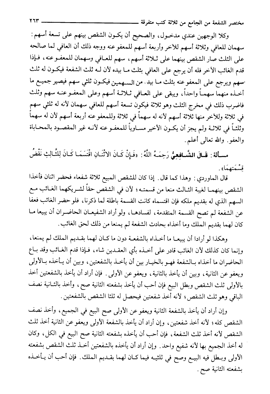 وَكِلَا الْوَجْهَيْنِ عِنْدِي مَدْخُولٌ، وَالصَّحِيحُ أَنْ يَكُونَ الشِّقْصُ بَيْنَهُمْ عَلَى تِسْعَةِ أَسْهُمٍ: سَهْمَانِ لِلْعَافِي وَثَلَاثَةُ أَسْهُمٍ لِلْآخَرِ وَأَرْبَعَةُ أَسْهُمٍ لِلْمَعْفُوِّ عَنْهُ وَوَجْهُ ذَلِكَ أَنَّ الْعَافِيَ لَمَّا صَالَحَهُ عَلَى الثُّلُثِ صَارَ الشِّقْصُ بَيْنَهُمَا عَلَى ثَلَاثَةِ أَسْهُمٍ، سَهْمٌ لِلْعَافِي وَسَهْمَانِ لِلْمَعْفُوِّ عَنْهُ، فَإِذَا قَدِمَ الْغَائِبُ الْآخَرُ فَلَهُ أَنْ يَرْجِعَ عَلَى الْعَافِي بِثُلُثِ مَا بِيَدِهِ لِأَنَّ لَهُ ثُلُثَ الشُّفْعَةِ فَيَكُونُ لَهُ ثُلُثَ سَهْمٍ وَيَرْجِعُ عَلَى الْمَعْفُوِّ عَنْهُ بِثُلُثِ مَا بِيَدِهِ مِنَ السَّهْمَيْنِ فَيَكُونُ ثُلُثَيْ سَهْمٍ فَيَصِيرُ جَمِيعُ مَا أَخَذَهُ مِنْهُمَا سَهْمًا وَاحِدًا، وَيَبْقَى عَلَى الْعَافِي ثَلَاثَةُ أَسْهُمٍ وَعَلَى الْمَعْفُوِّ عَنْهُ سَهْمٌ وَثُلُثٌ فَاضْرِبْ ذَلِكَ فِي مَخْرِجِ الثُّلُثِ وَهُوَ ثَلَاثَةٌ فَيَكُونُ تِسْعَةَ أَسْهُمٍ لِلْعَافِي سَهْمَانِ لِأَنَّهُ لَهُ ثُلُثَيْ سَهْمٍ فِي ثَلَاثَةٍ وَلِلْآخَرِ مِنْهَا ثَلَاثَةُ أَسْهُمٍ لِأَنَّهُ له سهماً فِي ثَلَاثَةٍ وَلِلْمَعْفُوِّ عَنْهُ أَرْبَعَةُ أَسْهُمٍ لِأَنَّ لَهُ سَهْمًا وَثُلُثًا فِي ثَلَاثَةٍ وَلَمْ يَجُزْ أَنْ يَكُونَ الْأَخِيرُ مُسَاوِيًا لِلْمَعْفُوِّ عَنْهُ لِأَنَّهُ غَيْرُ الْمَقْصُودِ بِالْمُحَابَاةِ وَالْعَفْوِ. وَاللَّهُ تَعَالَى أَعْلَمُ.