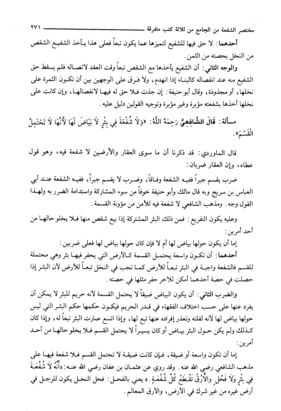 قَالَ الشَّافِعِيُّ رَحِمَهُ اللَّهُ: " وَلَا شُفْعَةَ فِي بئرٍ لَا بَيَاضَ لَهَا لِأَنَّهَا لَا تَحْتَمِلُ الْقَسْمَ ".