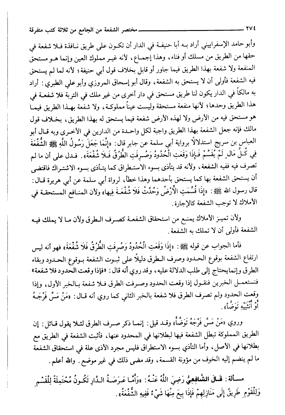 وَأَبُو حَامِدٍ الْإِسْفِرَايِينِيُّ أَرَادَ بِهِ أبا حنيفة فِي الدَّارِ أَنْ تَكُونَ عَلَى طَرِيقٍ نَافِذَةٍ فَلَا شُفْعَةَ فِي حَقِّهَا مِنَ الطَّرِيقِ مِنْ مَسْلَكٍ أَوْ فَنَاءٍ، وَهَذَا إِجْمَاعٌ، لِأَنَّهُ غَيْرُ مَمْلُوكِ الْعَيْنِ وَإِنَّمَا هُوَ مُسْتَحِقُّ الْمَنْفَعَةِ وَلَا شُفْعَةَ بِهَذَا الطَّرِيقِ فِيمَا جَاوَرَ أَوْ قَابَلَ بِخِلَافِ قَوْلِ أبي حنيفة؛ لِأَنَّهُ لَمَّا لَمْ يَسْتَحِقَّ فِيهِ الشُّفْعَةَ فَأَوْلَى أَنْ لَا يَسْتَحِقَّ بِهِ الشُّفْعَةَ، وَقَالَ أَبُو إِسْحَاقَ الْمَرْوَزِيُّ وَأَبُو عَلِيٍّ الطَّبَرِيُّ: أَرَادَ بِهِ مَالِكًا فِي الدَّارِ يَكُونُ لَنَا طَرِيقٌ مُسْتَحَقٌّ فِي دَارٍ أُخْرَى مِنْ غَيْرِ مِلْكٍ فِي التُّرْبَةِ فَلَا شُفْعَةَ فِي هَذَا الطَّرِيقِ وَحْدَهَا؛ لِأَنَّهَا مَنْفَعَةٌ مُسْتَحَقَّةٌ وَلَيْسَتْ عَيْنًا مَمْلُوكَةً، وَلَا شُفْعَةَ بِهَذَا الطَّرِيقِ فِيمَا هُوَ مُسْتَحَقٌّ فِيهِ مِنَ الْأَرْضِ وَلَا لِهَذِهِ الْأَرْضِ شُفْعَةٌ فِيمَا يُسْتَحَقُّ لَهُ بِهَذَا الطَّرِيقِ، بِخِلَافِ قَوْلِ مَالِكٍ فَإِنَّهُ جَعَلَ الشُّفْعَةَ بِهَذَا الطَّرِيقِ وَاجِبَةً لِكُلِّ وَاحِدَةٍ مِنَ الدَّارَيْنِ فِي الْأُخْرَى وَبِهِ قَالَ أَبُو الْعَبَّاسِ بْنُ سُرَيْجٍ اسْتِدْلَالًا بِرِوَايَةِ أَبِي سَلَمَةَ عَنْ جَابِرٍ قَالَ: " إِنَّمَا جَعَلَ رَسُولُ اللَّهِ - صَلَّى اللَّهُ عَلَيْهِ وَسَلَّم َ - الشُّفْعَةَ فِي كُلِّ مالٍ لَمْ يُقْسَمْ فَإِذَا وَقَعَتِ الْحُدُودُ وَصُرِفَتِ الطُّرُقُ فَلَا شُفْعَةَ ". فَدَلَّ عَلَى أَنَّ مَا لَمْ تُصْرَفْ فِيهِ فَفِيهِ الشُّفْعَةُ، وَلِأَنَّهُ قَدْ يَتَأَذَّى بِسُوءِ الِاسْتِطْرَاقِ كَمَا يَتَأَذَّى بِسُوءِ الِاشْتِرَاكِ فَاقْتَضَى أَنْ يَسْتَحِقَّ الشُّفْعَةَ بها كما يستحق بأحدهما وهذا خطأ، لرواة أَبِي سَلَمَةَ عَنْ أَبِي هُرَيْرَةَ قَالَ: قَالَ رَسُولُ اللَّهِ - صَلَّى اللَّهُ عَلَيْهِ وَسَلَّم َ -: " إذا قسمت الأرض وحدت فلا شفعة فيها " وَلِأَنَّ الْمَنَافِعَ الْمُسْتَحَقَّةَ فِي الْأَمْلَاكِ لَا تُوجِبُ الشفعة كالإجارة.