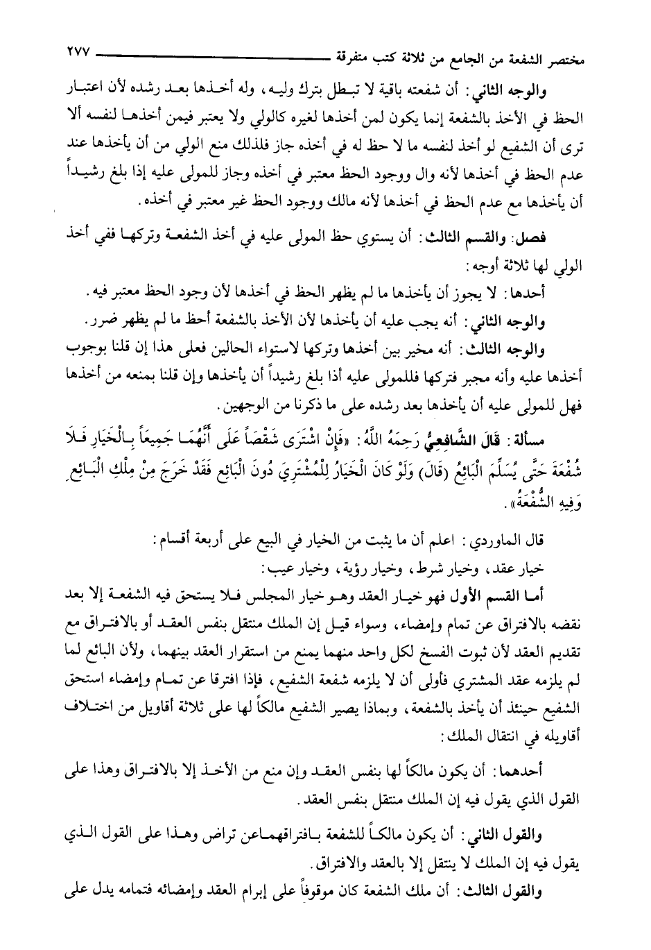 أَمَّا الْقِسْمُ الْأَوَّلُ فَهُوَ خِيَارُ الْعَقْدِ وَهُوَ خِيَارُ الْمَجْلِسِ فَلَا يَسْتَحِقُّ فِيهِ الشُّفْعَةَ إِلَّا بَعْدَ نَقْضِهِ بِالِافْتِرَاقِ عَنْ تَمَامٍ وَإِمْضَاءٍ، وَسَوَاءٌ قِيلَ إِنَّ الْمِلْكَ مُنْتَقِلٌ بِنَفْسِ الْعَقْدِ أَوْ بِالِافْتِرَاقِ مَعَ تَقْدِيمِ الْعَقْدِ لِأَنَّ ثُبُوتَ الْفَسْخِ لِكُلِّ وَاحِدٍ مِنْهُمَا يَمْنَعُ مِنَ اسْتِقْرَارِ الْعَقْدِ بَيْنَهُمَا، وَلِأَنَّ الْبَائِعَ لَمَّا لَمْ يَلْزَمْهُ عَقْدُ الْمُشْتَرِي فَأَوْلَى أَنْ لَا يَلْزَمَهُ شُفْعَةُ الشَّفِيعِ، فَإِذَا افْتَرَقَا عَنْ تَمَامٍ وَإِمْضَاءٍ اسْتَحَقَّ الشَّفِيعُ حِينَئِذٍ أَنْ يَأْخُذَ بِالشُّفْعَةِ، وَبِمَاذَا يَصِيرُ الشَّفِيعُ مَالِكًا لَهَا عَلَى ثَلَاثَةِ أَقَاوِيلَ من اختلاف أقاويله في انتقال الملك.