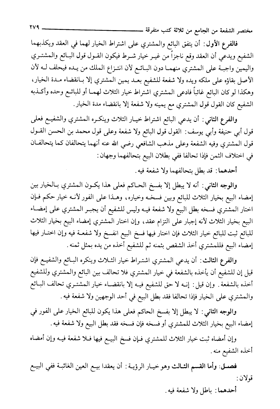 فَالْفَرْعُ الْأَوَّلُ: أَنْ يَتَّفِقَ الْبَائِعُ وَالْمُشْتَرِي عَلَى اشْتِرَاطِ الْخِيَارِ لَهُمَا فِي الْعَقْدِ وَيُكَذِّبَهُمَا الشَّفِيعُ وَيَدَّعِيَ أَنَّ الْعَقْدَ وَقَعَ نَاجِزًا مِنْ غَيْرِ خِيَارِ شَرْطٍ فَيَكُونُ الْقَوْلُ قَوْلَ الْبَائِعِ وَالْمُشْتَرِي وَالْيَمِينُ وَاجِبَةً عَلَى الْمُشْتَرِي مِنْهُمَا دُونَ الْبَائِعِ لِأَنَّ انْتِزَاعَ الْمِلْكِ مِنْ يَدِهِ فَيَحْلِفُ لَهُ لِأَنَّ الْأَصْلَ بَقَاؤُهُ عَلَى مِلْكِهِ وَيَدِهِ وَلَا شُفْعَةَ لِلشَّفِيعِ بَعْدَ يَمِينِ الْمُشْتَرِي إِلَّا بِانْقِضَاءِ مُدَّةِ الْخِيَارِ، وَهَكَذَا لَوْ كَانَ الْبَائِعُ غَائِبًا فَادَّعَى الْمُشْتَرِي اشْتِرَاطَ خِيَارِ الثَّلَاثِ لَهُمَا أَوْ لِلْبَائِعِ وَحْدَهُ وَأَكْذَبَهُ الشَّفِيعُ كَانَ الْقَوْلُ قَوْلَ الْمُشْتَرِي مَعَ يَمِينِهِ وَلَا شُفْعَةَ إِلَّا بِانْقِضَاءِ مُدَّةِ الْخِيَارِ.