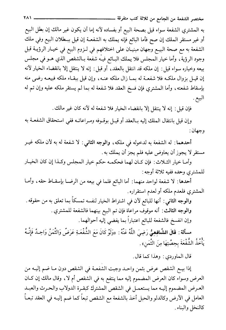 بِهِ الْمُشْتَرِي الشُّفْعَةَ سَوَاءٌ قِيلَ بِصِحَّةِ الْبَيْعِ أَوْ بِفَسَادِهِ لِأَنَّهُ إِمَّا أَنْ يَكُونَ غَيْرَ مَالِكٍ إِنْ بَطَلَ الْبَيْعُ أَوْ غَيْرَ مُسْتَقِرِّ الْمِلْكِ إِنْ صَحَّ فَأَمَّا الْبَائِعُ فَإِنَّهُ يَمْلِكُ بِهِ الشُّفْعَةَ إِنْ قِيلَ بِبُطْلَانِ الْبَيْعِ وَفِي مِلْكِ الشُّفْعَةِ بِهِ مَعَ صِحَّةِ الْبَيْعِ وَجْهَانِ مَبْنِيَّانِ عَلَى اخْتِلَافِهِمْ فِي لُزُومِ الْبَيْعِ فِي خِيَارِ الرُّؤْيَةِ قَبْلَ وُجُودِ الرُّؤْيَةِ، وَأَمَّا خِيَارُ المجلس فلا يملك البائع في شُفْعَةً بِالشِّقْصِ الَّذِي هُوَ فِي مَجْلِسِ بَيْعِهِ وَخِيَارِهِ سَوَاءٌ قِيلَ: إِنَّ مِلْكَهُ قَدِ انْتَقَلَ بِالْعَقْدِ، أَوْ قِيلَ: إِنَّهُ لَا يَنْتَقِلُ إِلَّا بِانْقِضَاءِ الْخِيَارِ لِأَنَّهُ إِنْ قِيلَ بِزَوَالِ مِلْكِهِ فَلَا شُفْعَةَ لَهُ بِمَا زَالَ مِلْكُهُ عَنْهُ، وَإِنْ قِيلَ بِبَقَاءِ مِلْكِهِ فَبَيْعُهُ رِضًى مِنْهُ بِإِسْقَاطِ شُفْعَتِهِ، وَأَمَّا الْمُشْتَرِي فَإِنْ فَسَخَ الْعَقْدَ فَلَا شُفْعَةَ لَهُ بِمَا لَمْ يَسْتَقِرَّ مِلْكُهُ عَلَيْهِ وَإِنْ تَمَّ لَهُ الْبَيْعُ.
