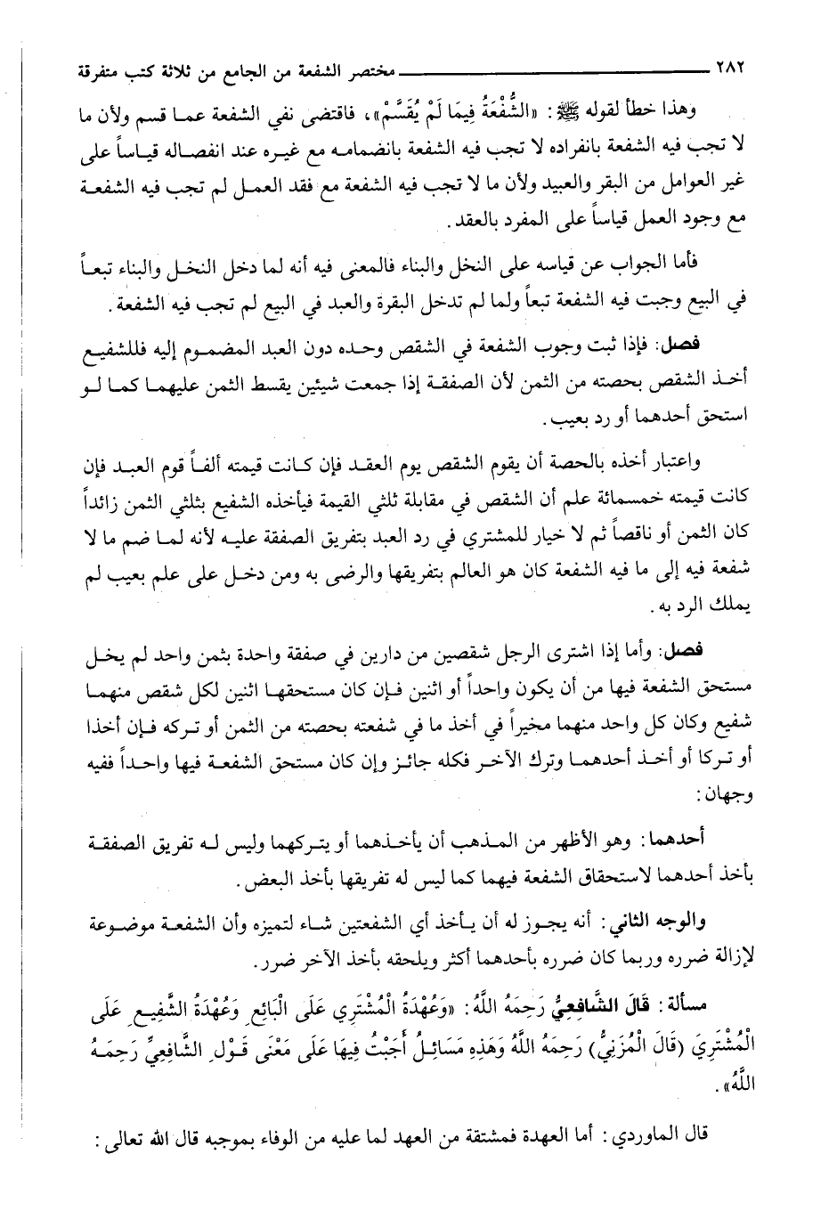 قَالَ الشَّافِعِيُّ رَحِمَهُ اللَّهُ: " وَعُهْدَةُ الْمُشْتَرِي عَلَى الْبَائِعِ وَعُهْدَةُ الشَّفِيعِ عَلَى الْمُشْتَرِي (قَالَ الْمُزَنِيُّ) رَحِمَهُ اللَّهُ وَهَذِهِ مَسَائِلُ أَجَبْتُ فِيهَا عَلَى مَعْنَى قَوْلِ الشَّافِعِيِّ رَحِمَهُ اللَّهُ ".