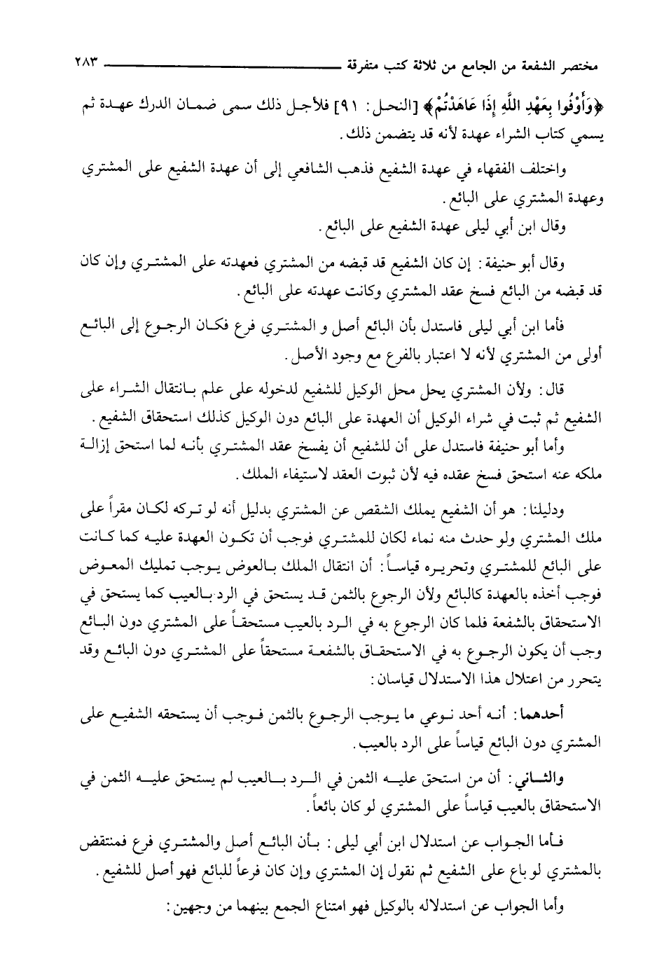 وَدَلِيلُنَا: هُوَ أَنَّ الشَّفِيعَ يَمْلِكُ الشِّقْصَ عَنِ الْمُشْتَرِي بِدَلِيلِ أَنَّهُ لَوْ تَرَكَهُ لَكَانَ مُقِرًّا عَلَى مِلْكِ الْمُشْتَرِي وَلَوْ حَدَثَ مِنْهُ نَمَاءٌ لَكَانَ لِلْمُشْتَرِي فَوَجَبَ أَنْ تَكُونَ الْعُهْدَةُ عَلَيْهِ كَمَا كَانَتْ عَلَى الْبَائِعِ لِلْمُشْتَرِي وَتَحْرِيرُهُ قِيَاسًا: أَنَّ انْتِقَالَ الْمِلْكِ بِالْعِوَضِ يُوجِبُ تَمْلِيكَ الْمُعَوَّضِ فَوَجَبَ أَخْذُهُ بِالْعُهْدَةِ كَالْبَائِعِ وَلِأَنَّ الرُّجُوعَ بِالثَّمَنِ قَدْ يُسْتَحَقُّ فِي الرَّدِّ بِالْعَيْبِ كَمَا يُسْتَحَقُّ فِي الِاسْتِحْقَاقِ بِالشُّفْعَةِ فَلَمَّا كَانَ الرُّجُوعُ بِهِ فِي الرَّدِّ بِالْعَيْبِ مُسْتَحَقًّا عَلَى الْمُشْتَرِي دُونَ الْبَائِعِ وَجَبَ أَنْ يَكُونَ الرُّجُوعُ بِهِ فِي الِاسْتِحْقَاقِ بِالشُّفْعَةِ مُسْتَحَقًّا عَلَى الْمُشْتَرِي دُونَ الْبَائِعِ وَقَدْ يتحرر مِنَ اعْتِلَالِ هَذَا الِاسْتِدْلَالِ قِيَاسَانِ: