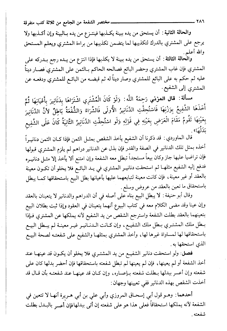 وَقَالَ أبو حنيفة: لَا يَبْطُلُ الْبَيْعُ بِنَاءً عَلَى أَصْلِهِ فِي أَنَّ الدَّرَاهِمَ وَالدَّنَانِيرَ لَا يَتَعَيَّنَانِ بِالْعَقْدِ وَإِنْ عُيِّنَا وَقَدْ مَضَى الْكَلَامُ مَعَهُ فِي كِتَابِ الْبُيُوعِ أَنَّهُمَا يَتَعَيَّنَانِ فِي الْعُقُودِ وَإِذَا ثَبَتَ بُطْلَانُ الْبَيْعِ بِتَعَيُّنِهِمَا بِالْعَقْدِ بَطَلَتِ الشُّفْعَةُ وَاسْتُرْجِعَ الشِّقْصُ مِنْ يَدِ الشَّفِيعِ لِأَنَّهُ يَمْلِكُهَا عَنِ الْمُشْتَرِي فَإِذَا بَطَلَ مِلْكُ الْمُشْتَرِي بَطَلَ مِلْكُ الشَّفِيعِ، وَإِنْ كَانَتِ الدَّنَانِيرُ غَيْرَ مُعَيَّنَةٍ لَمْ يَبْطُلِ الْبَيْعُ بِاسْتِحْقَاقِهَا لَهَا لِمُسَاوَاةِ غَيْرِهَا لَهَا، وَأَخَذَ الْمُشْتَرِي بِمِثْلِهَا وَالشَّفِيعُ عَلَى شُفْعَتِهِ لِصِحَّةِ الْبَيْعِ الَّذِي اسْتَحَقَّهَا بِهِ.