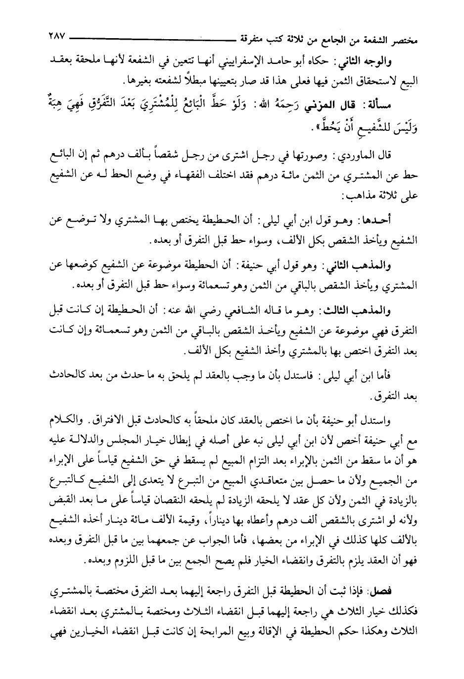 وَالْمَذْهَبُ الثَّالِثُ: وَهُوَ مَا قَالَهُ الشَّافِعِيُّ رَضِيَ اللَّهُ عَنْهُ: أَنَّ الْحَطِيطَةَ إِنْ كَانَتْ قَبْلَ التَّفَرُّقِ فَهِيَ مَوْضُوعَةٌ عَنِ الشَّفِيعِ وَيَأْخُذُ الشِّقْصَ بِالْبَاقِي مِنَ الثَّمَنِ وَهُوَ تِسْعُمِائَةٍ وَإِنْ كَانَتْ بَعْدَ التَّفَرُّقِ اخْتَصَّ بِهَا بِالْمُشْتَرِي وَأَخَذَ الشَّفِيعُ بِكُلِّ الْأَلْفِ.
