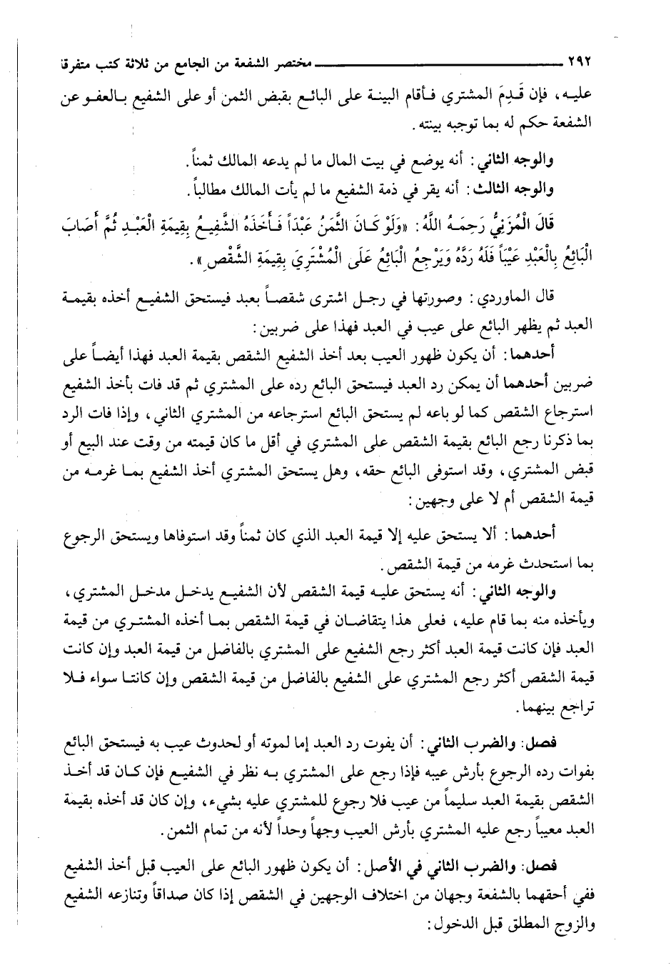 أَحَدُهُمَا: أَنْ يَكُونَ ظُهُورُ الْعَيْبِ بَعْدَ أَخْذِ الشَّفِيعِ الشِّقْصِ بِقِيمَةِ الْعَبْدِ فَهَذَا أَيْضًا عَلَى ضَرْبَيْنِ أَحَدُهُمَا أَنْ يُمْكِنَ رَدُّ الْعَبْدِ فَيَسْتَحِقُّ الْبَائِعُ رَدَّهُ عَلَى الْمُشْتَرِي ثُمَّ قَدْ فَاتَ بِأَخْذِ الشَّفِيعِ اسْتِرْجَاعَ الشِّقْصِ كَمَا لَوْ بَاعَهُ لَمْ يَسْتَحِقَّ الْبَائِعُ اسْتِرْجَاعَهُ مِنَ الْمُشْتَرِي الثَّانِي، وَإِذَا فَاتَ الرَّدُّ بِمَا ذَكَرْنَا رَجَعَ الْبَائِعُ بِقِيمَةِ الشِّقْصِ عَلَى الْمُشْتَرِي فِي أَقَلِّ مَا كَانَ قِيمَتُهُ مِنْ وَقْتٍ عِنْدَ الْبَيْعِ أَوْ قَبْضِ الْمُشْتَرِي، وَقَدِ اسْتَوْفَى الْبَائِعُ حَقَّهُ، وَهَلْ يَسْتَحِقُّ الْمُشْتَرِي أَخْذَ الشَّفِيعِ بِمَا غَرِمَهُ مِنْ قِيمَةِ الشِّقْصِ أَمْ لَا عَلَى وَجْهَيْنِ: