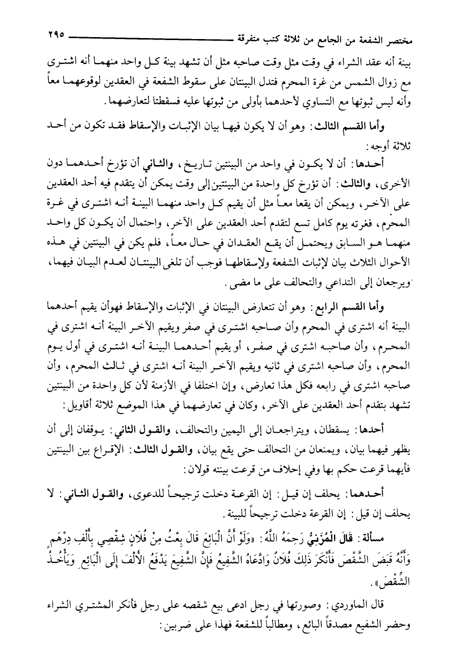 أَحَدُهَا: أَنْ لَا يَكُونَ فِي وَاحِدٍ مِنَ الْبَيِّنَتَيْنِ تاريخ، والثاني أن تؤرخ أحدهما دُونَ الْأُخْرَى، وَالثَّالِثُ: أَنْ تُؤَرَّخَ كُلُّ وَاحِدَةٍ مِنَ الْبَيِّنَتَيْنِ إِلَى وَقْتٍ يُمْكِنُ أَنْ يَتَقَدَّمَ فِيهِ أَحَدُ الْعَقْدَيْنِ عَلَى الْآخَرِ، وَيُمْكِنُ أَنْ يَقَعَا مَعًا مِثْلَ أَنْ يُقِيمَ كُلُّ وَاحِدٍ مِنْهُمَا الْبَيِّنَةَ أَنَّهُ اشْتَرَى فِي غُرَّةِ الْمُحَرَّمِ، فَغُرَّتُهُ يَوْمٌ كَامِلٌ تَسَعُ لِتَقَدُّمِ أَحَدِ الْعَقْدَيْنِ عَلَى الْآخَرِ، وَاحْتِمَالٌ أَنْ يَكُونَ كُلُّ وَاحِدٍ مِنْهُمَا هُوَ السَّابِقَ وَيُحْتَمَلُ أَنْ يَقَعَ الْعَقْدَانِ فِي حَالٍ مَعًا، فَلَمْ يَكُنْ فِي الْبَيِّنَتَيْنِ فِي هَذِهِ الْأَحْوَالِ الثَّلَاثِ بَيَانٌ لِإِثْبَاتِ الشُّفْعَةِ ولإسقاطهما فَوَجَبَ أَنْ تُلْغَى الْبَيِّنَتَانِ لِعَدَمِ الْبَيَانِ فِيهِمَا، وَيَرْجِعَانِ إِلَى التَّدَاعِي وَالتَّحَالُفِ عَلَى مَا مَضَى.