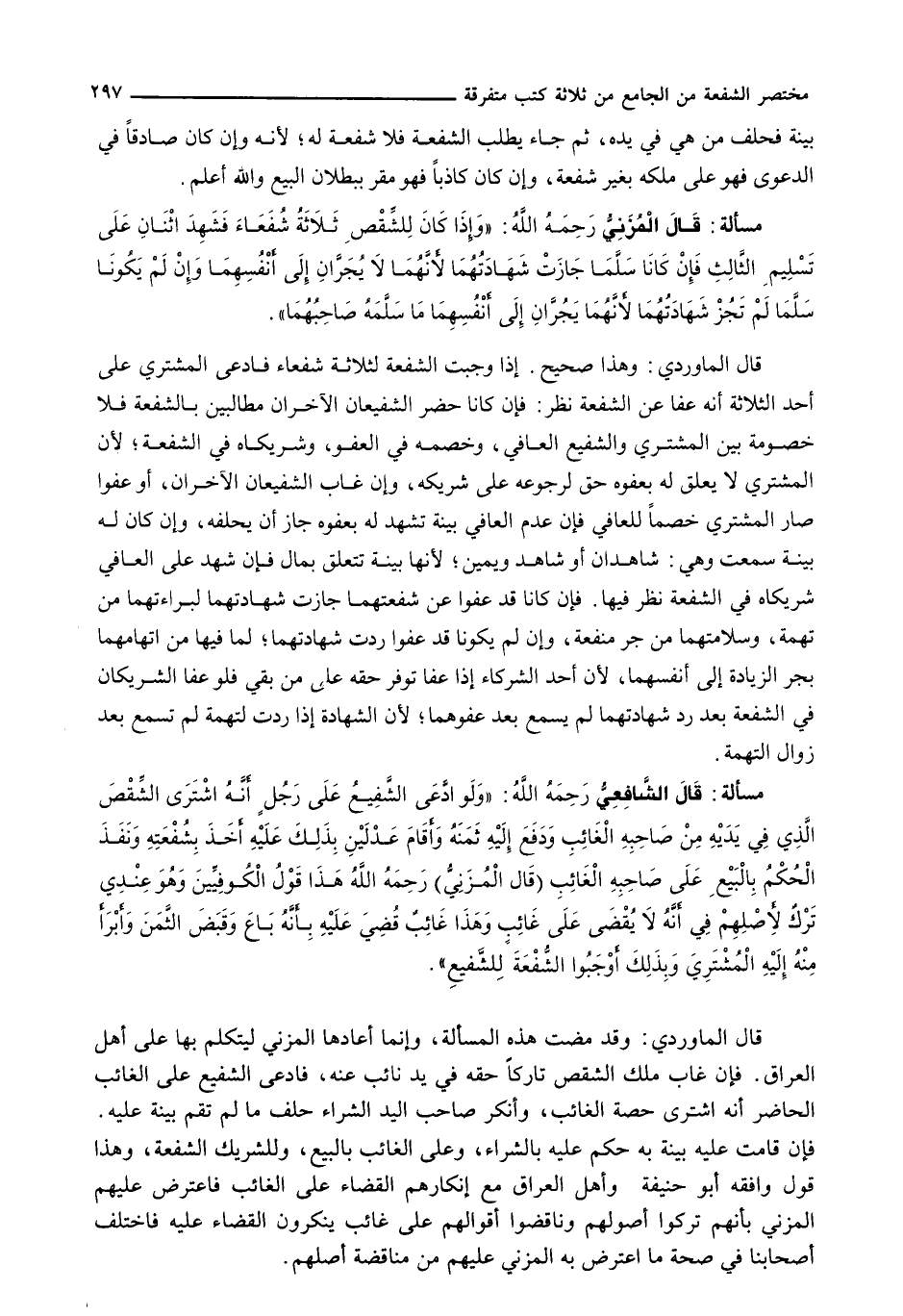 قَالَ الْمَاوَرْدِيُّ: وَهَذَا صَحِيحٌ. إِذَا وَجَبَتِ الشُّفْعَةُ لِثَلَاثَةِ شُفَعَاءَ فَادَّعَى الْمُشْتَرِي عَلَى أَحَدِ الثَّلَاثَةِ أَنَّهُ عَفَا عَنِ الشُّفْعَةِ نُظِرَ: فَإِنْ كانا حَضَرَ الشَّفِيعَانِ الْآخَرَانِ مُطَالِبَيْنِ بِالشُّفْعَةِ فَلَا خُصُومَةَ بَيْنَ الْمُشْتَرِي وَالشَّفِيعِ الْعَافِي، وَخَصْمَهُ فِي الْعَفْوِ، وَشَرِيكَاهُ فِي الشُّفْعَةِ؛ لِأَنَّ الْمُشْتَرِيَ لَا يُعَلَّقُ به بِعَفْوِهِ حَقٌّ لِرُجُوعِهِ عَلَى شَرِيكِهِ، وَإِنْ غَابَ الشَّفِيعَانِ الْآخَرَانِ، أَوْ عَفَوَا صَارَ الْمُشْتَرِي خَصْمًا لِلْعَافِي فَإِنْ عَدِمَ الْعَافِي بَيِّنَةً تَشْهَدُ لَهُ بِعَفْوِهِ جَازَ أَنْ يُحْلِفَهُ، وَإِنْ كَانَ لَهُ بَيِّنَةٌ سُمِعَتْ وَهِيَ: شَاهِدَانِ أَوْ شَاهِدٌ وَيَمِينٌ؛ لِأَنَّهَا بَيِّنَةٌ تَتَعَلَّقُ بِمَالٍ فَإِنْ شَهِدَ عَلَى الْعَافِي شَرِيكَاهُ فِي الشُّفْعَةِ نُظِرَ فِيهَا. فَإِنْ كَانَا قَدْ عَفَوَا عَنْ شُفْعَتِهِمَا جَازَتْ شَهَادَتُهُمَا لِبَرَاءَتِهِمَا مِنْ تُهْمَةٍ وَسَلَامَتِهِمَا مِنْ جَرِّ مَنْفَعَةٍ، وَإِنْ لَمْ يَكُونَا قَدْ عَفَوَا رُدِّتْ شَهَادَتُهُمَا؛ لما فيها من اتهامهما يجر الزِّيَادَةِ إِلَى أَنْفُسِهِمَا، لِأَنَّ أَحَدَ الشُّرَكَاءِ إِذَا عَفَا تَوَفَّرَ حَقُّهُ عَلَى مَنْ بَقِيَ فَلَوْ عَفَا الشَّرِيكَانِ فِي الشُّفْعَةِ بَعْدَ رَدِّ شَهَادَتِهِمَا لَمْ يُسْمَعْ بَعْدَ عَفْوِهِمَا؛ لِأَنَّ الشَّهَادَةَ إِذَا رُدِّتْ لِتُهْمَةٍ لَمْ تُسْمَعْ بَعْدَ زَوَالِ التُّهْمَةِ.