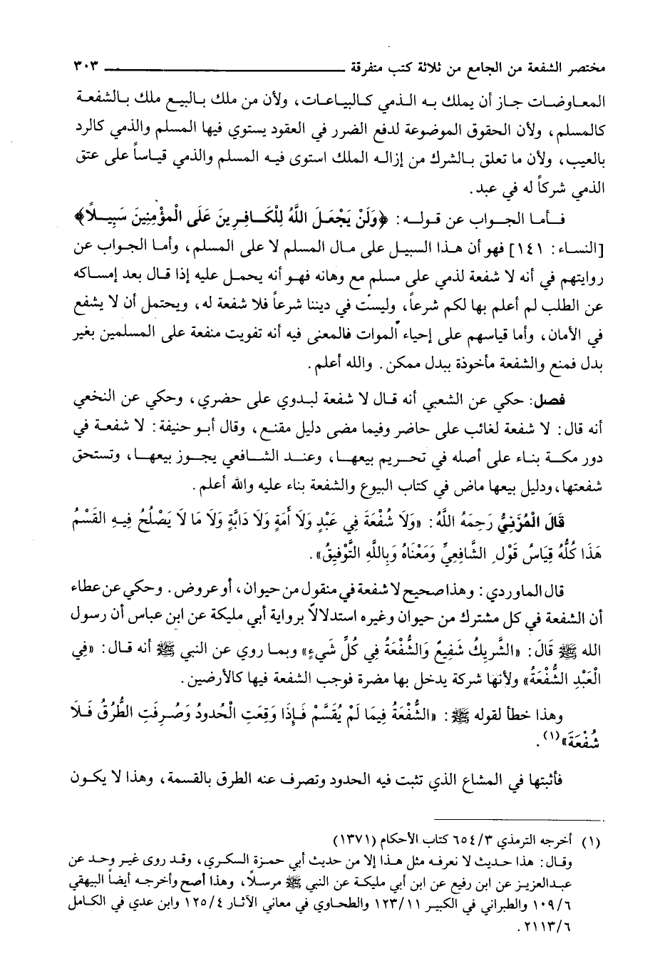 فَأَمَّا الْجَوَابُ عَنْ قَوْلِهِ: {وَلَنْ يَجْعَلَ اللهُ لِلْكَافِرِينَ عَلَى المُؤْمِنِينَ سَبِيلاً} (النساء: 141) فَهُوَ أَنَّ هَذَا السَّبِيلَ عَلَى مَالِ الْمُسْلِمِ لَا عَلَى الْمُسْلِمِ، وَأَمَّا الْجَوَابُ عَنْ رِوَايَتِهِمْ فِي أَنَّهُ لَا شُفْعَةَ لِذِمِّيٍّ عَلَى مُسْلِمٍ مَعَ وَهَانِهِ فَهُوَ أَنَّهُ يَحْمِلُ عَلَيْهِ إِذَا قَالَ بَعْدَ إِمْسَاكِهِ عَنِ الطَّلَبِ لَمْ أَعْلَمْ بِهَا لَكُمْ شَرْعًا، وَلَيْسَتْ فِي دِينِنَا شَرْعًا فَلَا شُفْعَةَ لَهُ، وَيُحْتَمَلُ أَنْ لَا يَشْفَعَ فِي الْأَمَانِ، وَأَمَّا قِيَاسُهُمْ عَلَى إِحْيَاءِ الْمَوَاتِ فَالْمَعْنَى فِيهِ أَنَّهُ تَفْوِيتُ مَنْفَعَةٍ عَلَى الْمُسْلِمِينَ بِغَيْرِ بَدَلٍ فَمُنِعَ وَالشُّفْعَةُ مَأْخُوذَةٌ بِبَدَلٍ مُمْكِنٍ. وَاللَّهُ أَعْلَمُ.