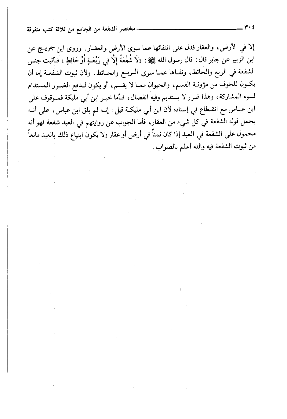 إِلَّا فِي الْأَرْضِ، وَالْعَقَارِ فَدَلَّ عَلَى انْتِفَائِهَا عَمَّا سِوَى الْأَرْضِ وَالْعَقَارِ. وَرَوَى ابْنُ جُرَيْجٍ عَنِ ابْنِ الزُّبَيْرِ عَنْ جَابِرٍ قَالَ: قَالَ رَسُولُ اللَّهِ - صَلَّى اللَّهُ عَلَيْهِ وَسَلَّم َ -: " لَا شُفْعَةَ إِلَّا فِي ربعةٍ أَوْ حائطٍ " فَأَثْبَتَ جِنْسَ الشُّفْعَةِ فِي الرَّبْعِ وَالْحَائِطِ، وَنَفَاهَا عَمَّا سِوَى الرَّبْعِ وَالْحَائِطِ، وَلِأَنَّ ثُبُوتَ الشُّفْعَةِ إما أن يكون للخوف من مؤونة الْقَسْمِ، وَالْحَيَوَانُ مِمَّا لَا يُقْسَمُ، أَوْ يَكُونَ لِدَفْعِ الضَّرَرِ الْمُسْتَدَامِ لِسُوءِ الْمُشَارَكَةِ، وَهَذَا ضَرَرٌ لَا يَسْتَدِيمُ وَفِيهِ انْفِصَالٌ، فَأَمَّا خَبَرُ ابْنِ أَبِي مُلَيْكَةَ فَمَوْقُوفٌ عَلَى ابْنِ عَبَّاسٍ مَعَ انْقِطَاعٍ فِي إِسْنَادِهِ لِأَنَّ ابْنَ أَبِي مُلَيْكَةَ قِيلَ: إِنَّهُ لَمْ يَلْقَ ابْنَ عَبَّاسٍ، عَلَى أَنَّهُ يُحْمَلُ قَوْلُهُ الشُّفْعَةُ فِي كُلِّ شَيْءٍ مِنَ الْعَقَارِ، فَأَمَّا الْجَوَابُ عَنْ رِوَايَتِهِمْ فِي الْعَبْدِ شُفْعَةٌ فَهُوَ أَنَّهُ مَحْمُولٌ عَلَى الشُّفْعَةِ فِي الْعَبْدِ إِذَا كَانَ ثَمَنًا فِي أَرْضٍ أَوْ عَقَارٍ وَلَا يَكُونُ ابْتِيَاعُ ذَلِكَ بِالْعَبْدِ مَانِعًا مِنْ ثُبُوتِ الشُّفْعَةِ فِيهِ وَاللَّهُ أَعْلَمُ بالصواب.