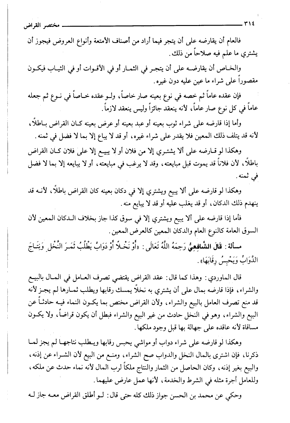 قَالَ الْمَاوَرْدِيُّ: وَهَذَا كَمَا قَالَ: عَقْدُ الْقِرَاضِ يَقْتَضِي تَصَرُّفَ الْعَامِلِ فِي الْمَالِ بِالْبَيْعِ وَالشِّرَاءِ، فَإِذَا قَارَضَهُ بِمَالٍ عَلَى أَنْ يَشْتَرِيَ بِهِ نَخْلًا يُمْسِكُ رِقَابَهَا وَيَطْلُبُ ثِمَارَهَا لَمْ يَجُزْ لِأَنَّهُ قَدْ مَنَعَ تَصَرُّفَ الْعَامِلِ بِالْبَيْعِ وَالشِّرَاءِ، وَلِأَنَّ الْقِرَاضَ مُخْتَصٌّ بِمَا يَكُونُ النَّمَاءُ فِيهِ حَادِثًا عَنِ الْبَيْعِ وَالشِّرَاءِ، وَهُوَ فِي النَّخْلِ حَادِثٌ مِنْ غَيْرِ الْبَيْعِ وَالشِّرَاءِ فَبَطَلَ أَنْ يَكُونَ قِرَاضًا، وَلَا يَكُونَ مُسَاقَاةً لِأَنَّهُ عَاقَدَهُ عَلَى جَهَالَةٍ بِهَا قَبْلَ وُجُودِ مِلْكِهَا.