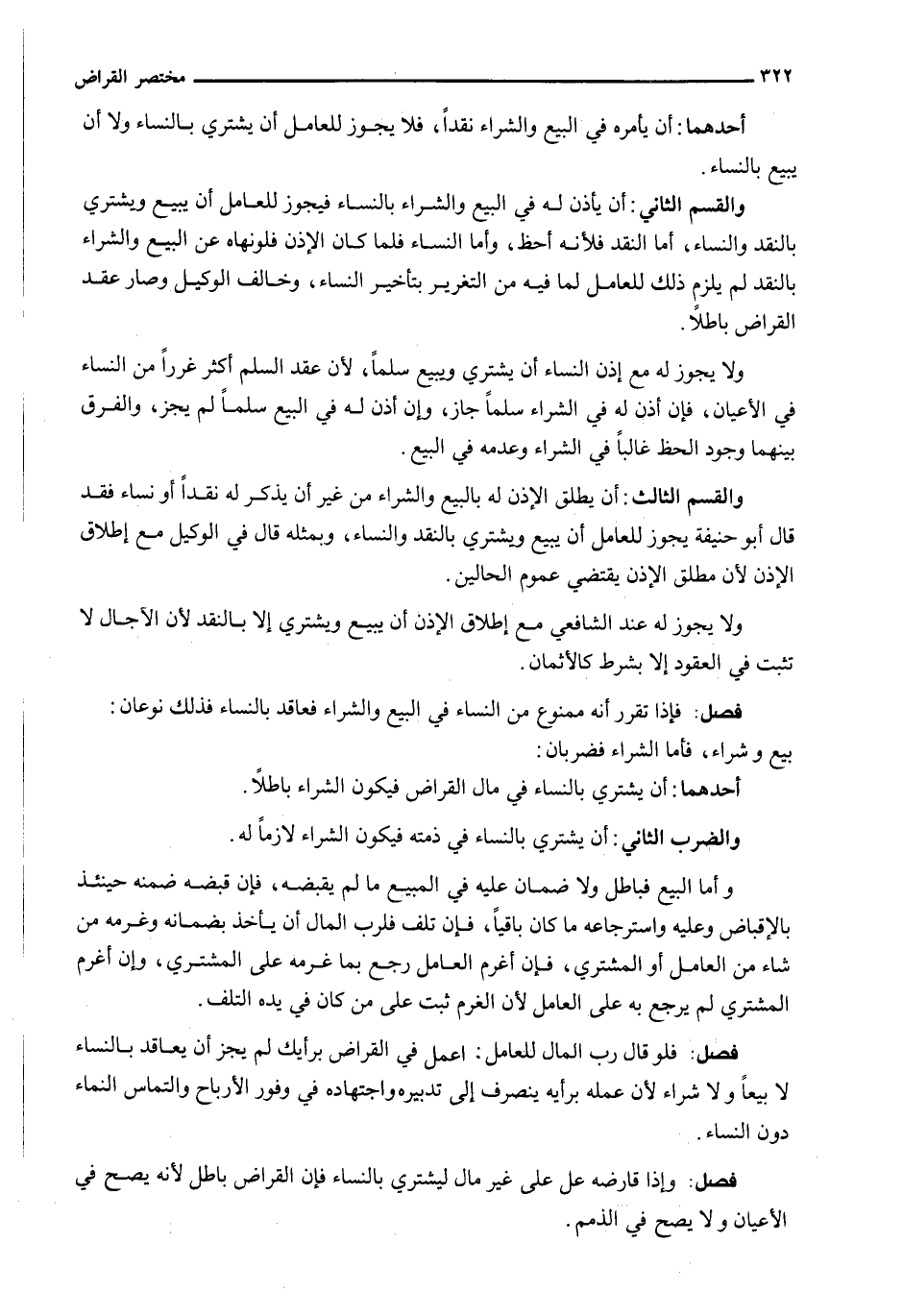 وَالْقِسْمُ الثَّانِي: أَنْ يَأْذَنَ لَهُ فِي الْبَيْعِ وَالشِّرَاءِ بِالنَّسَاءِ فَيَجُوزُ لِلْعَامِلِ أَنْ يَبِيعَ وَيَشْتَرِيَ بِالنَّقْدِ وَالنَّسَاءِ، أَمَّا النَّقْدُ فَلِأَنَّهُ أَحَظُّ، وَأَمَّا النَّسَاءُ فَلَمَّا كَانَ الْإِذْنُ فَلَوْ نَهَاهُ عَنِ الْبَيْعِ وَالشِّرَاءِ بِالنَّقْدِ لَمْ يَلْزَمْ ذَلِكَ لِلْعَامِلِ لِمَا فِيهِ مِنَ التَّغْرِيرِ بِتَأْخِيرِ النَّسَاءِ، وَخَالَفَ الْوَكِيلَ وَصَارَ عَقْدُ الْقِرَاضِ بَاطِلًا.