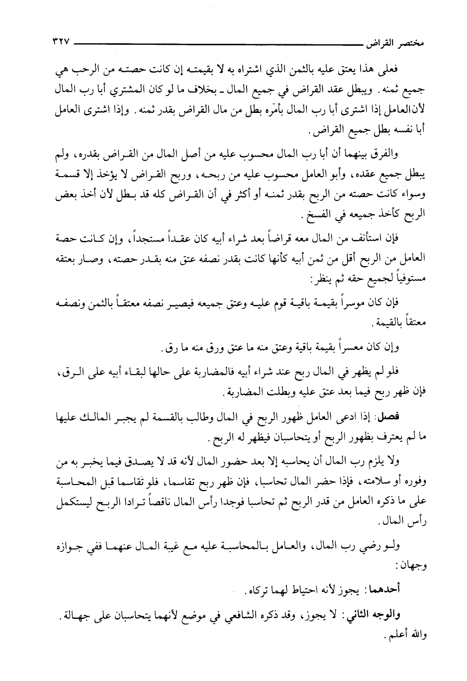 فَعَلَى هَذَا يُعْتَقُ عَلَيْهِ بِالثَّمَنِ الَّذِي اشْتَرَاهُ بِهِ لَا بِقِيمَتِهِ إِنْ كَانَتْ حِصَّتُهُ مِنَ الرحب هِيَ جَمِيعَ ثَمَنِهِ. وَيَبْطُلُ عَقْدُ الْقِرَاضِ فِي جَمِيعِ الْمَالِ - بِخِلَافِ مَا لَوْ كَانَ الْمُشْتَرِي أَبَا رَبِّ الْمَالِ لِأَنَّ الْعَامِلَ إِذَا اشْتَرَى أَبَا رَبِّ الْمَالِ بِأَمْرِهِ بَطَلَ مِنْ مَالِ الْقِرَاضِ بِقَدْرِ ثَمَنِهِ. وَإِذَا اشْتَرَى الْعَامِلُ أَبَا نَفْسِهِ بَطَلَ جَمِيعُ الْقِرَاضِ.