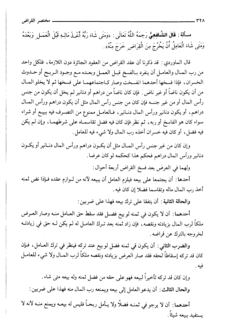 قَالَ الْمَاوَرْدِيُّ: قَدْ ذَكَرْنَا أَنَّ عَقْدَ الْقِرَاضِ مِنَ الْعُقُودِ الْجَائِزَةِ دُونَ اللَّازِمَةِ، فَلِكُلِّ وَاحِدٍ مِنْ رَبِّ الْمَالِ وَالْعَامِلِ أَنْ يَنْفَرِدَ بِالْفَسْخِ قَبْلَ الْعَمَلِ وَبِعْدَهُ مَعَ وُجُودِ الرِّبْحِ أَوْ حُدُوثِ الْخُسْرَانِ، فَإِذَا فَسَخَهَا أَحَدُهُمَا انْفَسَخَتْ وَصَارَ كَاجْتِمَاعِهِمَا عَلَى فَسْخِهَا ثُمَّ لَا يَخْلُو الْمَالُ مِنْ أَنْ يَكُونَ نَاضًّا أَوْ غَيْرَ نَاضٍّ. فَإِنْ كَانَ نَاضًّا مِنْ دَرَاهِمَ أَوْ دَنَانِيرَ لَمْ يَخْلُ أَنْ يَكُونَ مِنْ جِنْسِ رَأْسِ الْمَالِ أَوْ مِنْ غَيْرِ جِنْسِهِ فَإِنْ كَانَ مِنْ جِنْسِ رَأْسِ الْمَالِ مِثْلَ أَنْ يَكُونَ دَرَاهِمَ وَرَأْسُ الْمَالِ دَرَاهِمَ، أَوْ يَكُونَ دَنَانِيرَ وَرَأْسُ الْمَالِ دَنَانِيرَ، فَالْعَامِلُ مَمْنُوعٌ مِنَ التَّصَرُّفِ فِيهِ بِبَيْعٍ أَوْ شِرَاءٍ سَوَاءٌ كَانَ هُوَ الْفَاسِخَ أَوْ رَبُّهُ، ثُمَّ نُظِرَ فَإِنْ كَانَ فِيهِ فَضْلٌ تَقَاسَمَاهُ عَلَى شَرْطِهِمَا، وَإِنْ لَمْ يَكُنْ فِيهِ فَضْلٌ، أَوْ كَانَ فِيهِ خُسْرَانٌ أَخَذَهُ رَبُّ الْمَالِ وَلَا شَيْءَ فِيهِ لِلْعَامِلِ.