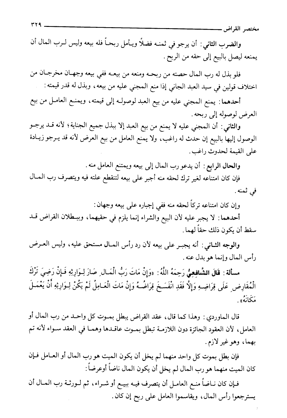قَالَ الْمَاوَرْدِيُّ: وَهَذَا كَمَا قَالَ، عَقْدُ الْقِرَاضِ يَبْطُلُ بِمَوْتِ كُلِّ وَاحِدٍ مِنْ رَبِّ الْمَالِ أَوِ الْعَامِلِ، لِأَنَّ الْعُقُودَ الْجَائِزَةَ دُونَ اللَّازِمَةِ تَبْطُلُ بِمَوْتِ عَاقِدِهَا وَهُمَا فِي الْعَقْدِ سَوَاءٌ لِأَنَّهُ تَمَّ بِهِمَا، وَهُوَ غَيْرُ لَازِمٍ.