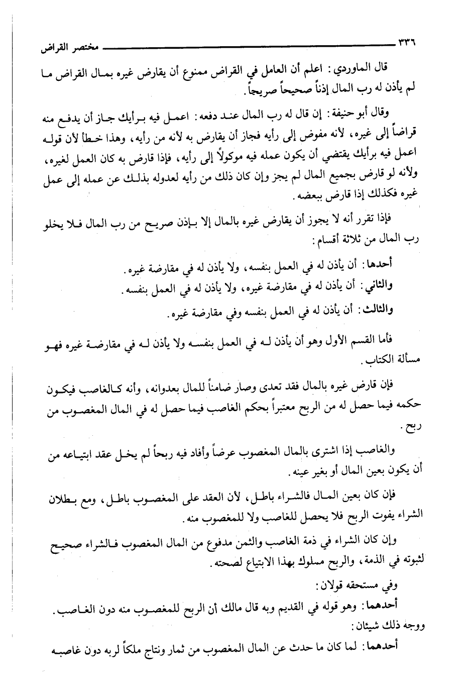 قَالَ الْمَاوَرْدِيُّ: اعْلَمْ أَنَّ الْعَامِلَ فِي الْقِرَاضِ مَمْنُوعٌ أَنْ يُقَارِضَ غَيْرَهُ بِمَالِ الْقِرَاضِ مَا لَمْ يَأْذَنْ لَهُ رَبُّ الْمَالِ إِذْنًا صَحِيحًا صَرِيحًا.