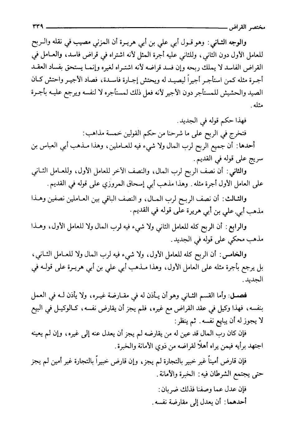وَالْوَجْهُ الثَّانِي: وَهُوَ قَوْلُ أَبِي عَلِيِّ بْنِ أَبِي هُرَيْرَةَ إِنَّ الْمُزَنِيَّ مُصِيبٌ فِي نَقْلِهِ وَالرِّبْحُ لِلْعَامِلِ الْأَوَّلِ دُونَ الثَّانِي، وَلِلثَّانِي عَلَيْهِ أُجْرَةُ الْمِثْلِ لِأَنَّهُ اشْتَرَاهُ فِي قِرَاضٍ فَاسِدٍ، وَالْعَامِلُ فِي الْقِرَاضِ الْفَاسِدِ لَا يَمْلِكُ رِبْحَهُ وَإِنْ فَسَدَ قِرَاضُهُ لِأَنَّهُ اشْتَرَاهُ لِغَيْرِهِ وَإِنَّمَا يَسْتَحِقُّ بِفَسَادِ الْعَقْدِ أُجْرَةَ مِثْلِهِ كَمَنِ اسْتَأْجَرَ أَجِيرًا لِيَصِيدَ لَهُ وَيَحْتَشَّ إِجَارَةً فَاسِدَةً، فَصَادَ الْأَجِيرُ وَاحْتَشَّ كَانَ الصَّيْدُ وَالْحَشِيشُ لِلْمُسْتَأْجِرِ دُونَ الْأَجِيرِ لِأَنَّهُ فَعَلَ ذَلِكَ لِمُسْتَأْجِرِهِ لَا لِنَفْسِهِ وَيَرْجِعُ عَلَيْهِ بِأُجْرَةِ مِثْلِهِ.