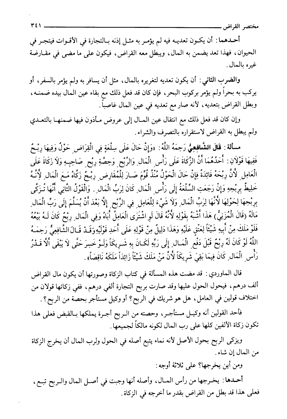 قَالَ الْمَاوَرْدِيُّ: قَدْ مَضَتْ هَذِهِ الْمَسْأَلَةُ فِي كِتَابِ الزَّكَاةِ وَصُورَتُهَا أَنْ يَكُونَ مَالُ الْقِرَاضِ أَلْفَ دِرْهَمٍ، فَيَحُولَ الْحَوْلُ عَلَيْهَا وَقَدْ صَارَتْ بِرِبْحِ التِّجَارَةِ أَلْفَيْ دِرْهَمٍ، فَفِي زَكَاتِهَا قَوْلَانِ مِنَ اخْتِلَافِ قَوْلَيْنِ فِي الْعَامِلِ، هَلْ هُوَ شَرِيكٌ فِي الرِّبْحِ؟ أَوْ وَكِيلٌ مُسْتَأْجِرٌ بِحِصَّةٍ مِنَ الرِّبْحِ؟