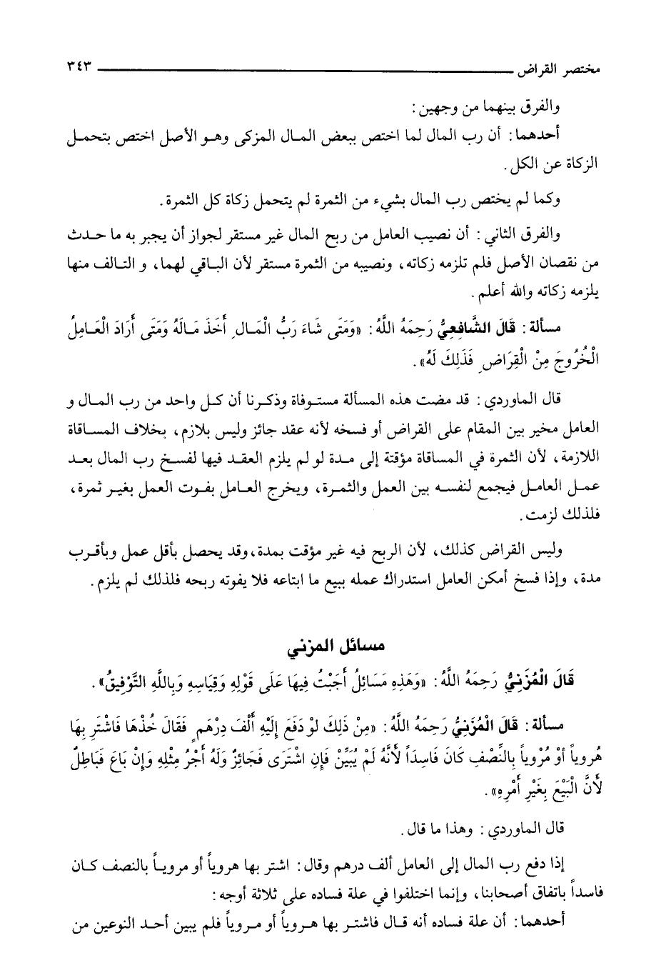 قَالَ الْمَاوَرْدِيُّ: قَدْ مَضَتْ هَذِهِ الْمَسْأَلَةُ مُسْتَوْفَاةً وَذَكَرْنَا أَنَّ كُلَّ وَاحِدٍ مِنْ رَبِّ الْمَالِ وَالْعَامِلِ مُخَيَّرٌ بَيْنَ الْمُقَامِ عَلَى الْقِرَاضِ أَوْ فَسْخِهِ لِأَنَّهُ عَقْدٌ جَائِزٌ وَلَيْسَ بِلَازِمٍ، بِخِلَافِ الْمُسَاقَاةِ اللَّازِمَةِ، لِأَنَّ الثَّمَرَةَ فِي الْمُسَاقَاةِ مُؤَقَّتَةٌ إِلَى مُدَّةٍ لَوْ لَمْ يَلْزَمِ الْعَقْدُ فِيهَا لَفَسَخَ رَبُّ الْمَالِ بَعْدَ عَمَلِ الْعَامِلِ فَيَجْمَعُ لِنَفْسِهِ بَيْنَ الْعَمَلِ وَالثَّمَرَةِ، وَيَخْرُجُ الْعَامِلُ بِفَوْتِ الْعَمَلِ بِغَيْرِ ثَمَرَةٍ، فَلِذَلِكَ لَزِمَتْ.