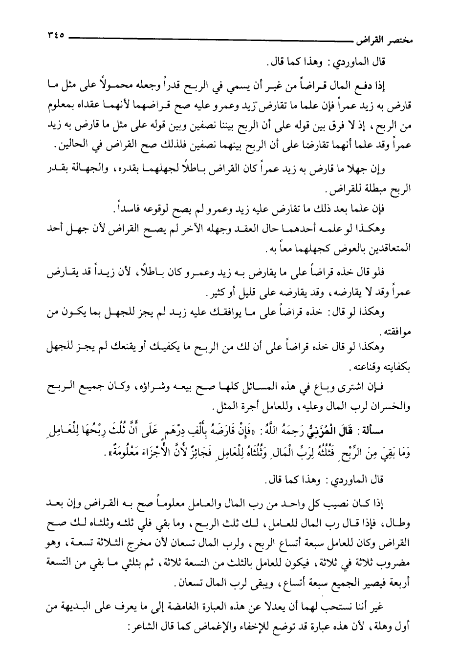 قال المزني رَحِمَهُ اللَّهُ: " فَإِنْ قَارَضَهُ بِأَلْفِ درهمٍ عَلَى أَنَّ ثُلُثَ رِبْحِهَا لِلْعَامِلِ وَمَا بَقِيَ مِنَ الرِّبْحِ فَثُلُثُهُ لِرَبِّ الْمَالِ وَثُلُثَاهُ لِلْعَامِلِ فجائزٌ لِأَنَّ الْأَجْزَاءَ معلومةٌ ".