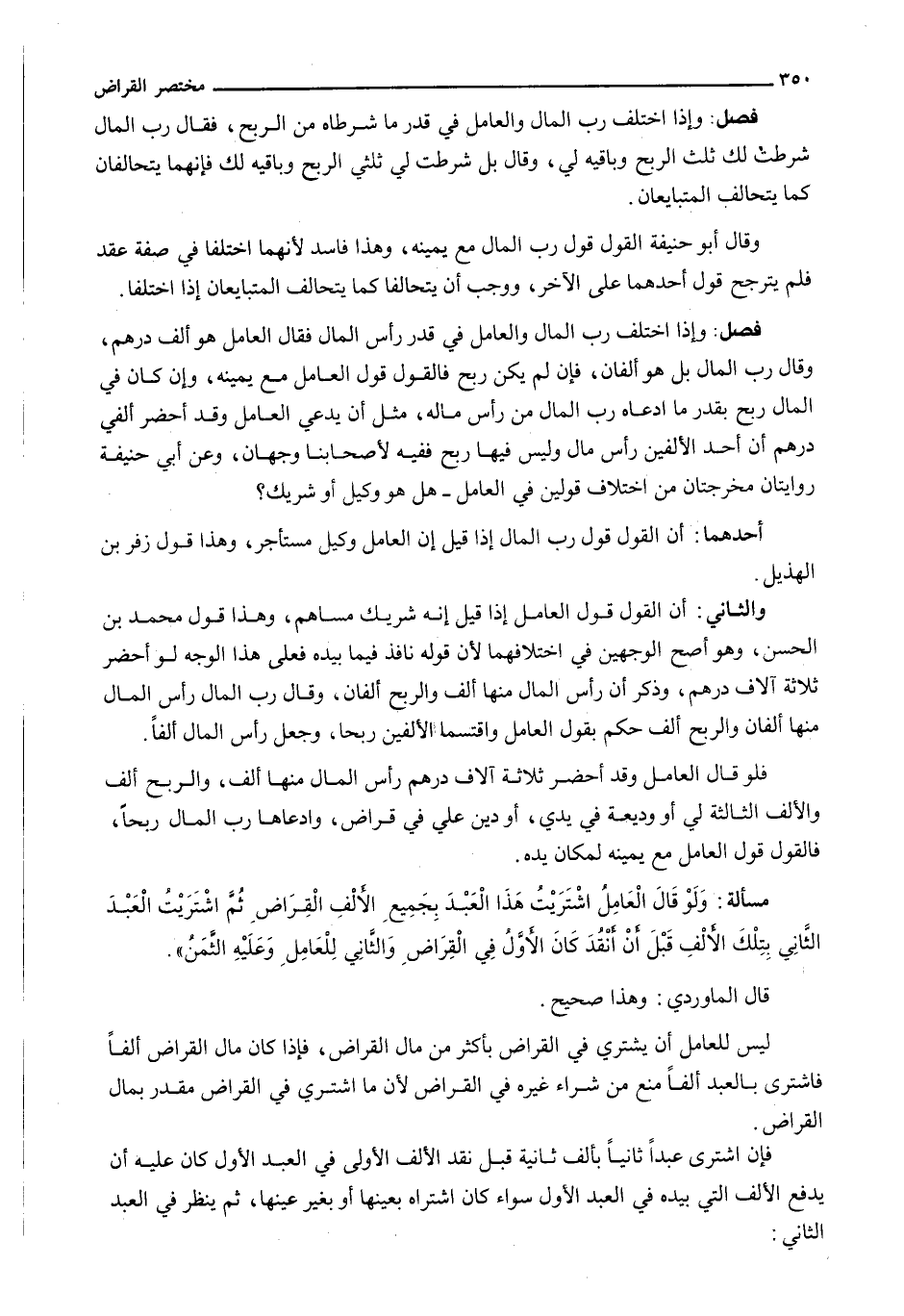 : وَإِذَا اخْتَلَفَ رَبُّ الْمَالِ وَالْعَامِلُ فِي قَدْرِ مَا شَرَطَاهُ مِنَ الرِّبْحِ، فَقَالَ رَبُّ الْمَالِ شَرَطْتُ لَكَ ثُلُثَ الرِّبْحِ وَبَاقِيهِ لِي، وَقَالَ بَلْ شَرَطْتَ لِي ثُلُثَيِ الرِّبْحِ وَبَاقِيهِ لَكَ فَإِنَّهُمَا يَتَحَالَفَانِ كَمَا يَتَحَالَفُ الْمُتَبَايِعَانِ.