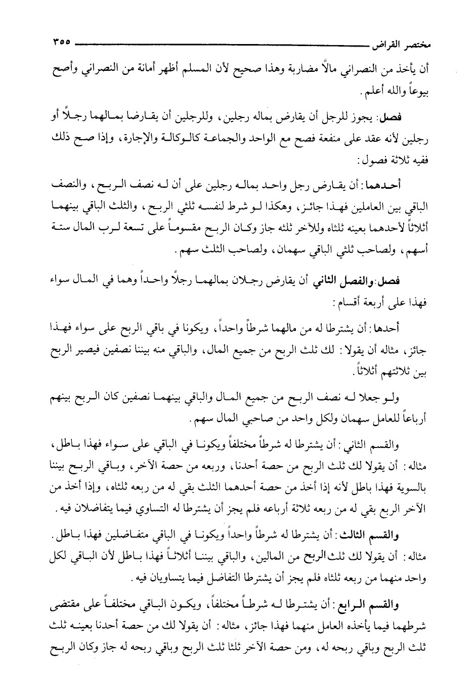 وَالْقِسْمُ الثَّانِي: أَنْ يَشْتَرِطَا لَهُ شَرْطًا مُخْتَلِفًا وَيَكُونَا فِي الْبَاقِي عَلَى سَوَاءٍ فَهَذَا بَاطِلٌ، مثاله: أن يقولا لك ثلث الربح من حِصَّةِ أَحَدِنَا، وَرُبُعُهُ مِنْ حِصَّةِ الْآخَرِ، وَبَاقِي الرِّبْحِ بَيْنَنَا بِالسَّوِيَّةِ فَهَذَا بَاطِلٌ لِأَنَّهُ إِذَا أَخَذَ مِنْ حِصَّةِ أَحَدِهِمَا الثُّلُثَ بَقِيَ لَهُ مِنْ رُبُعِهِ ثُلُثَاهُ، وَإِذَا أَخَذَ مِنَ الْآخَرِ الرُّبْعَ بَقِيَ لَهُ مِنْ رُبُعِهِ ثَلَاثَةُ أَرْبَاعِهِ فَلَمْ يَجُزْ أَنْ يَشْتَرِطَا لَهُ التَّسَاوِيَ فِيمَا يَتَفَاضَلَانِ فِيهِ.