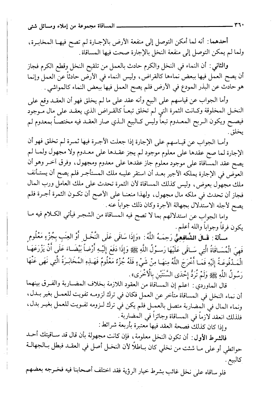 فَالشَّرْطُ الْأَوَّلُ: أَنْ تَكُونَ النَّخْلُ مَعْلُومَةً، فَإِنْ كَانَتْ مَجْهُولَةً بِأَنْ قَالَ قَدْ سَاقَيْتُكَ أَحَدَ حَوَائِطِي أَوْ عَلَى مَا شِئْتَ مِنْ نَخْلِي كَانَ بَاطِلًا لِأَنَّ النَّخْلَ أَصْلٌ فِي الْعَقْدِ فَبَطَلَ بِالْجَهَالَةِ كَالْبَيْعِ.