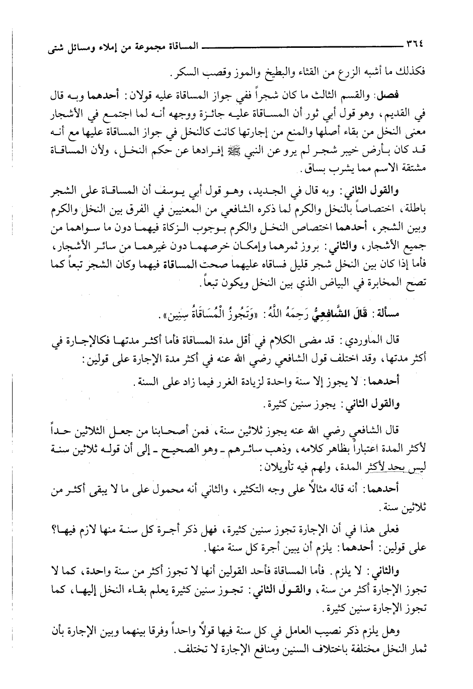 قَالَ الشَّافِعِيُّ رَحِمَهُ اللَّهُ: " وَتَجُوزُ الْمُسَاقَاةُ سِنِينَ ".
