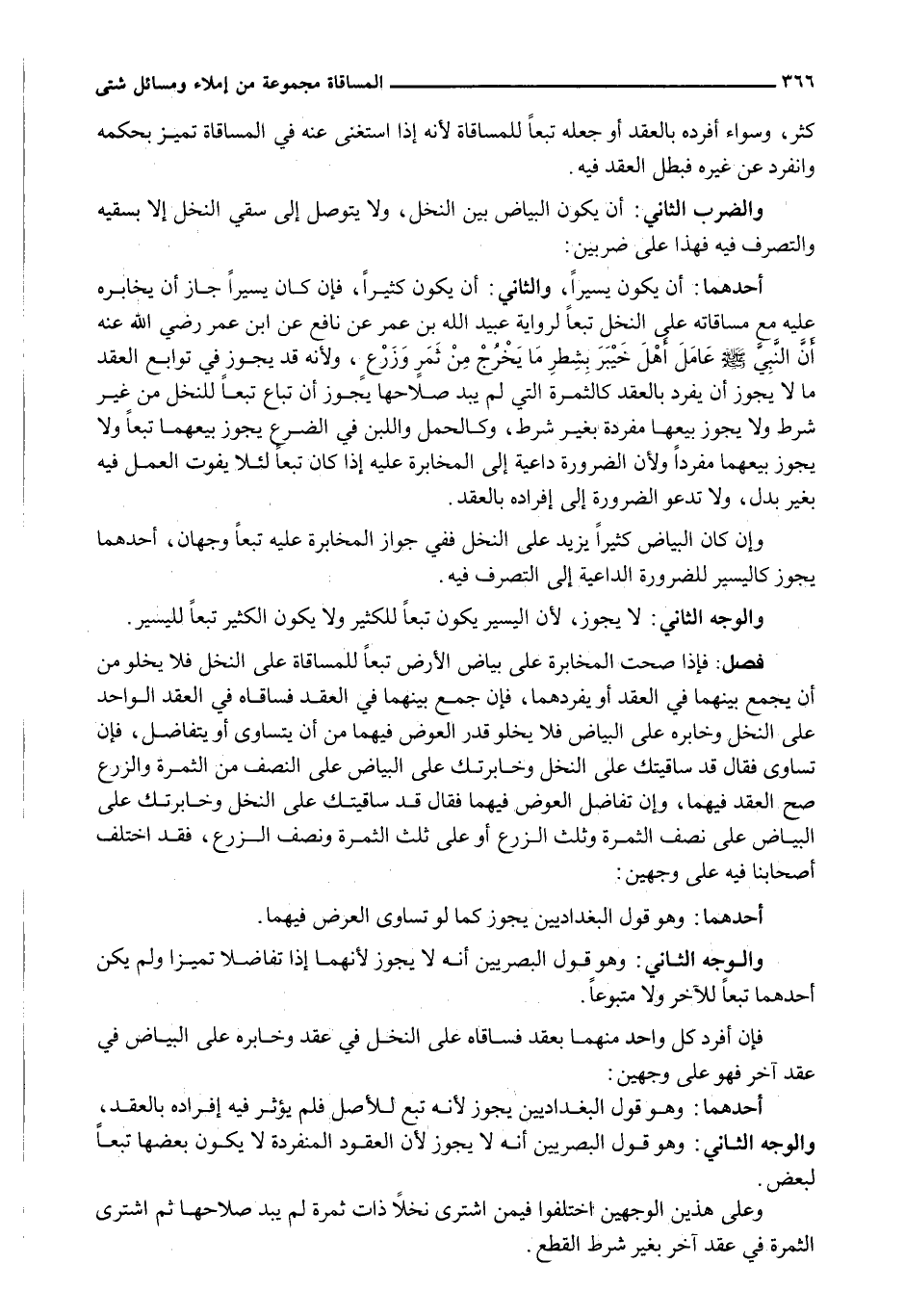 وَالضَّرْبُ الثَّانِي: أَنْ يَكُونَ الْبَيَاضُ بَيْنَ النَّخْلِ، وَلَا يَتَوَصَّلُ إِلَى سَقْيِ النَّخْلِ إِلَّا بِسَقْيِهِ وَالتَّصَرُّفِ فِيهِ فَهَذَا عَلَى ضَرْبَيْنِ: