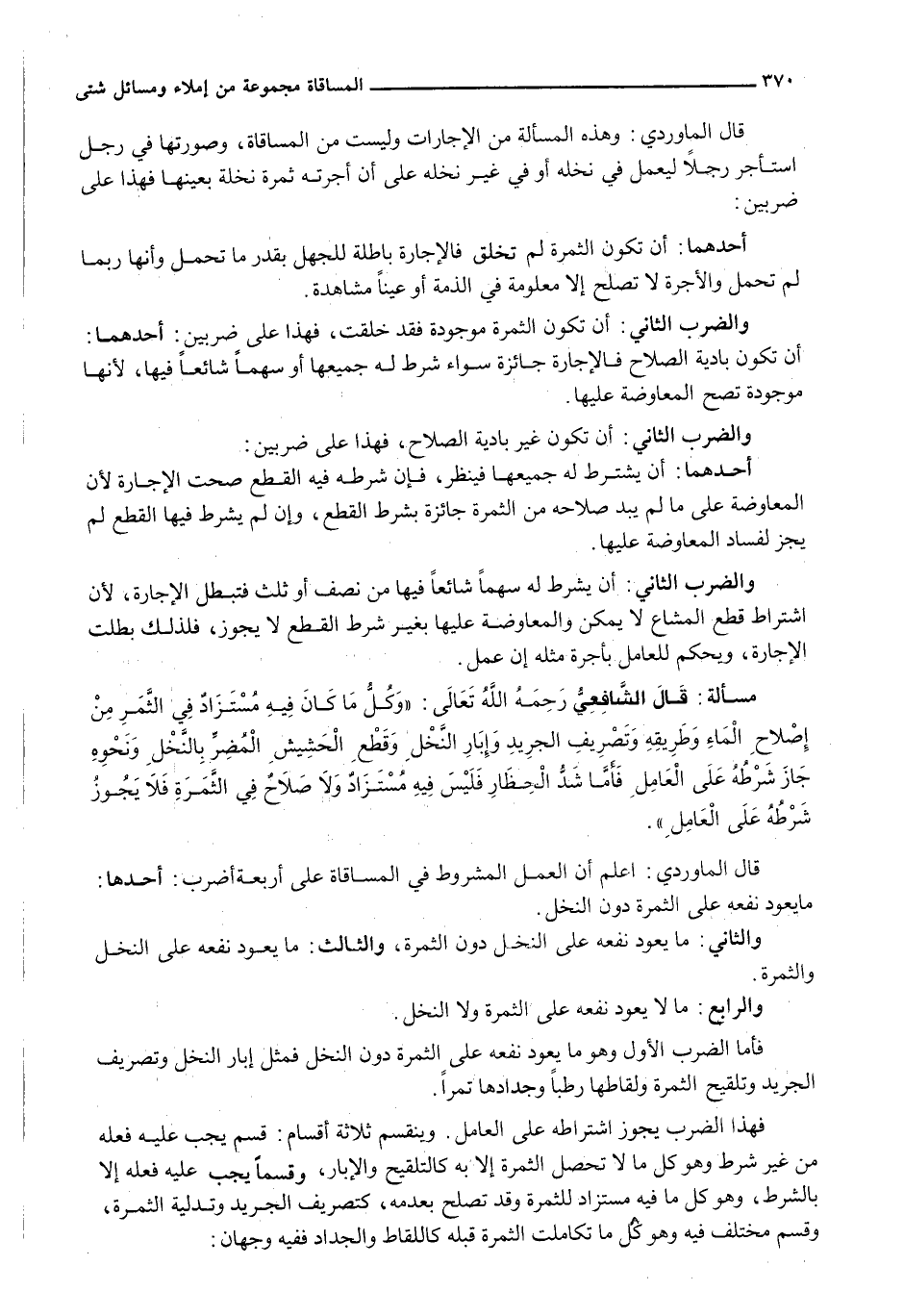 فَهَذَا الضَّرْبُ يَجُوزُ اشْتِرَاطُهُ عَلَى الْعَامِلِ. وَيَنْقَسِمُ ثَلَاثَةَ أَقْسَامٍ: قَسَمٌ يَجِبُ عَلَيْهِ فِعْلُهُ مِنْ غَيْرِ شرط وهو كل ما لاتحصل الثمرة إلا به كالتلقيح والإبار، وقسماً يَجِبُ عَلَيْهِ فِعْلُهُ إِلَّا بِالشَّرْطِ، وَهُوَ كُلُّ مَا فِيهِ مُسْتَزَادٌ لِلثَّمَرَةِ وَقَدْ تَصْلُحُ بِعَدَمِهِ، كَتَصْرِيفِ الْجَرِيدِ وَتَدْلِيَةِ الثَّمَرَةِ، وَقَسَمٌ مُخْتَلَفٌ فِيهِ وَهُوَ كُلُّ مَا تَكَامَلَتِ الثَّمَرَةُ قَبْلَهُ كَاللِّقَاطِ وَالْجِدَادِ فَفِيهِ وَجْهَانِ: