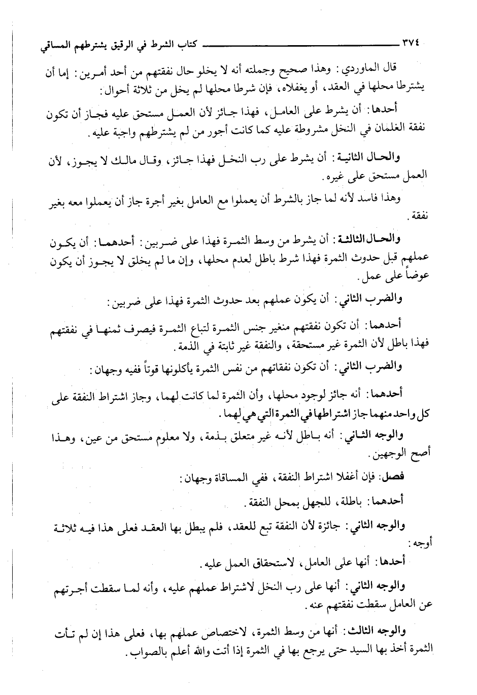 وَالْحَالُ الثَّالِثَةُ: أَنْ يَشْرُطَ مِنْ وَسَطِ الثَّمَرَةِ فَهَذَا عَلَى ضَرْبَيْنِ: أَحَدُهُمَا: أَنْ يَكُونَ عَمَلُهُمْ قَبْلَ حُدُوثِ الثَّمَرَةِ فَهَذَا شَرْطٌ بَاطِلٌ لِعَدَمِ مَحَلِّهَا، وَإِنَّ مَا لَمْ يُخْلَقْ لَا يَجُوزُ أَنْ يَكُونَ عِوَضًا عَلَى عَمَلٍ.
