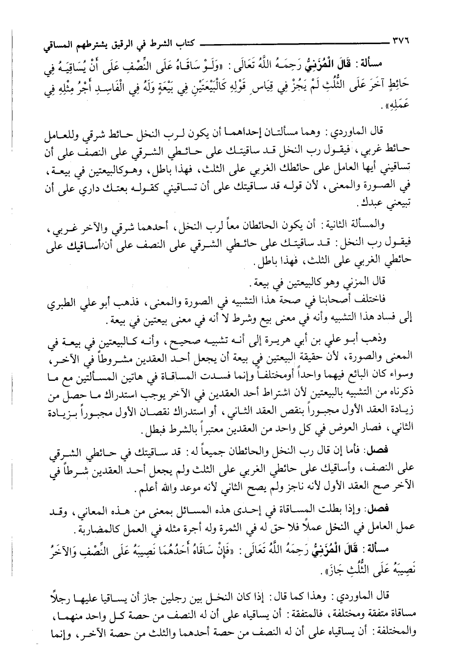 : فَأَمَّا إِنْ قَالَ رَبُّ النَّخْلِ وَالْحَائِطَانِ جَمِيعًا لَهُ: قَدْ سَاقَيْتُكَ فِي حَائِطَيِ الشَّرْقِيِّ عَلَى النِّصْفِ، وَأُسَاقِيكَ عَلَى حَائِطَيِ الْغَرْبِيِّ عَلَى الثُّلُثِ وَلَمْ يَجْعَلْ أَحَدَ الْعَقْدَيْنِ شَرْطًا فِي الْآخَرِ صَحَّ الْعَقْدُ الْأَوَّلُ لِأَنَّهُ نَاجِزٌ وَلَمْ يَصِحَّ الثَّانِي لِأَنَّهُ مُوعَدٌ وَاللَّهُ أَعْلَمُ.