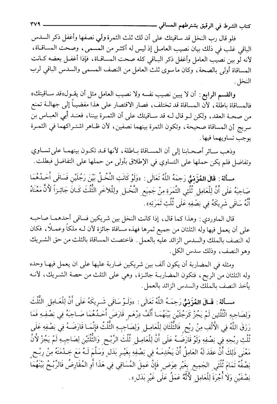 وَالْقِسْمُ الرَّابِعُ: أَنْ لَا يُبَيِّنَ نَصِيبَ نَفْسِهِ وَلَا نَصِيبَ الْعَامِلِ مِثْلَ أَنْ يَقُولَ " قَدْ سَاقَيْتُكَ " فَالْمُسَاقَاةُ بَاطِلَةٌ، لِأَنَّ الْمُسَاقَاةَ قَدْ تَخْتَلِفُ، فَصَارَ الِاقْتِصَارُ عَلَى هَذَا مُفْضِيًا إِلَى جَهَالَةٍ تَمْنَعُ مِنْ صِحَّةِ الْعَقْدِ، وَلَكِنْ لَوْ قَالَ لَهُ قَدْ سَاقَيْتُكَ عَلَى أَنَّ الثَّمَرَةَ بَيْنَنَا، فَعِنْدَ أَبِي الْعَبَّاسِ بْنِ سُرَيْجٍ أَنَّ الْمُسَاقَاةَ صَحِيحَةٌ، وَتَكُونُ الثَّمَرَةُ بَيْنَهُمَا نِصْفَيْنِ، لِأَنَّ ظَاهِرَ اشْتِرَاكِهِمَا فِي الثَّمَرَةِ يُوجِبُ تَسَاوِيَهُمَا فِيهَا.