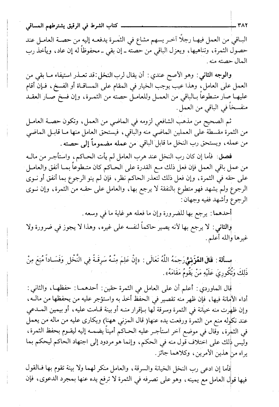 ثُمَّ الصَّحِيحُ مِنْ مَذْهَبِ الشَّافِعِيِّ لُزُومُهُ فِي الْمَاضِي مِنَ الْعَمَلِ، وَتَكُونُ حِصَّةُ الْعَامِلِ مِنَ الثَّمَرَةِ مُقَسَّطَةً عَلَى الْعَمَلَيْنِ الْمَاضِي مِنْهُ وَالْبَاقِي، فَيَسْتَحِقُّ الْعَامِلُ مِنْهَا مَا قَابَلَ الْمَاضِي مِنْ عَمَلِهِ، وَيَسْتَحِقُّ رَبُّ النَّخْلِ مَا قَابَلَ الْبَاقِيَ مِنْ عَمَلِهِ مَضْمُومًا إِلَى حِصَّتِهِ.