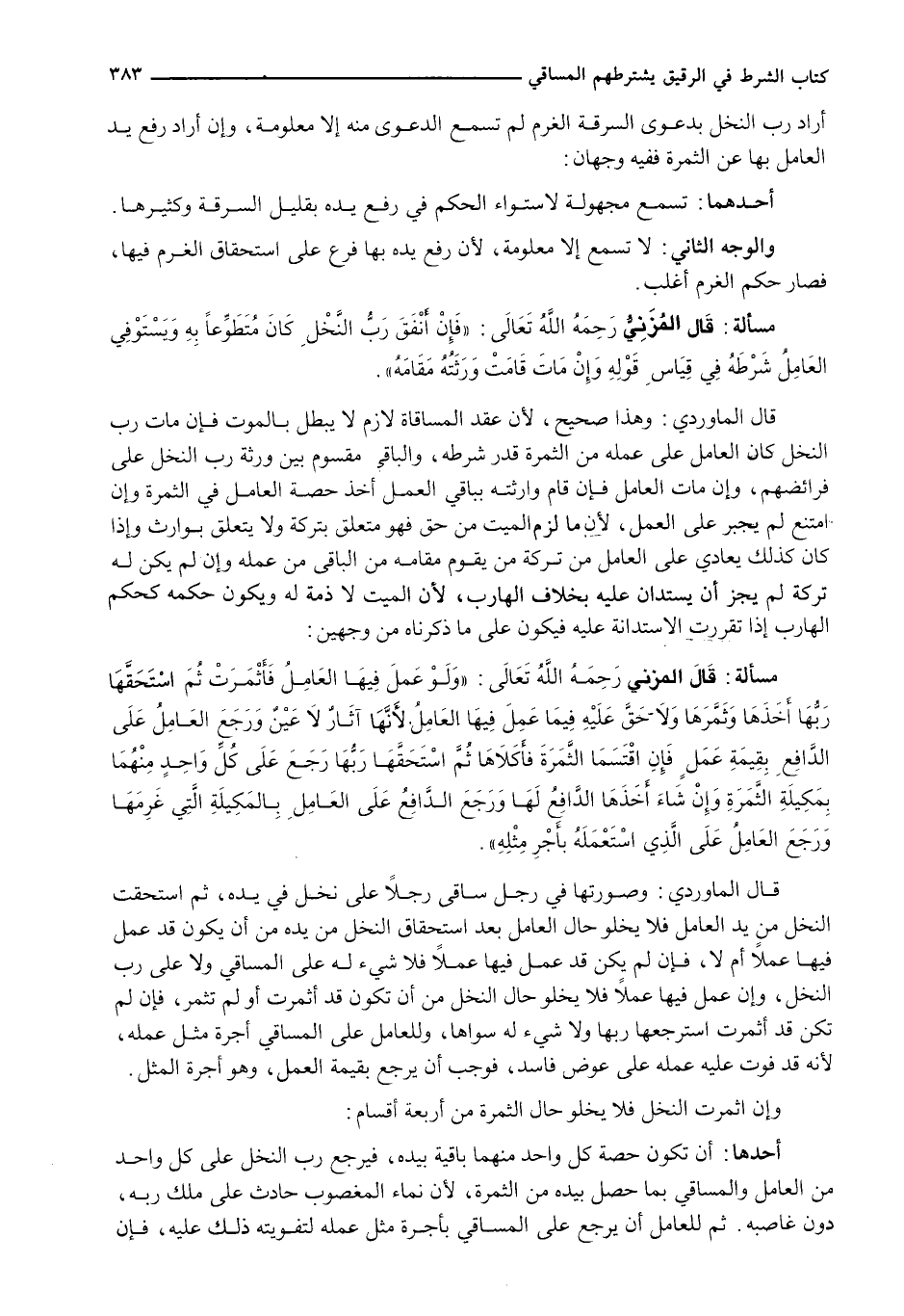 قَالَ الْمَاوَرْدِيُّ: وَهَذَا صحيح، لأن عقد المساقاة لازم لَا يَبْطُلُ بِالْمَوْتِ فَإِنْ مَاتَ رَبُّ النَّخْلِ كَانَ الْعَامِلُ عَلَى عَمَلِهِ مِنَ الثَّمَرَةِ قَدْرَ شَرْطِهِ، وَالْبَاقِي مَقْسُومٌ بَيْنَ وَرَثَةِ رَبِّ النَّخْلِ عَلَى فَرَائِضِهِمْ، وَإِنْ مَاتَ الْعَامِلُ فَإِنْ قَامَ وارثته بِبَاقِي الْعَمَلِ أَخَذَ حِصَّةَ الْعَامِلِ فِي الثَّمَرَةِ وَإِنِ امْتَنَعَ لَمْ يُجْبَرْ عَلَى الْعَمَلِ، لِأَنَّ مَا لَزِمَ الْمَيِّتَ مِنْ حَقٍّ فَهُوَ مُتَعَلِّقٌ بِتَرِكَةٍ وَلَا يَتَعَلَّقُ بِوَارِثٍ وَإِذَا كَانَ كَذَلِكَ يُعَادِي عَلَى الْعَامِلِ مِنْ تَرِكَةِ مَنْ يَقُومُ مقامه من الباقي من عمله وإن لَمْ يَكُنْ لَهُ تَرِكَةٌ لَمْ يَجُزْ أَنْ يستدان عليه بخلاف الهارب، لأن الميت لا ذمة له وَيَكُونُ حُكْمُهُ كَحُكْمِ الْهَارِبِ إِذَا تَقَرَّرَتِ الِاسْتِدَانَةُ عَلَيْهِ فَيَكُونُ عَلَى مَا ذَكَرْنَاهُ مِنْ وَجْهَيْنِ: