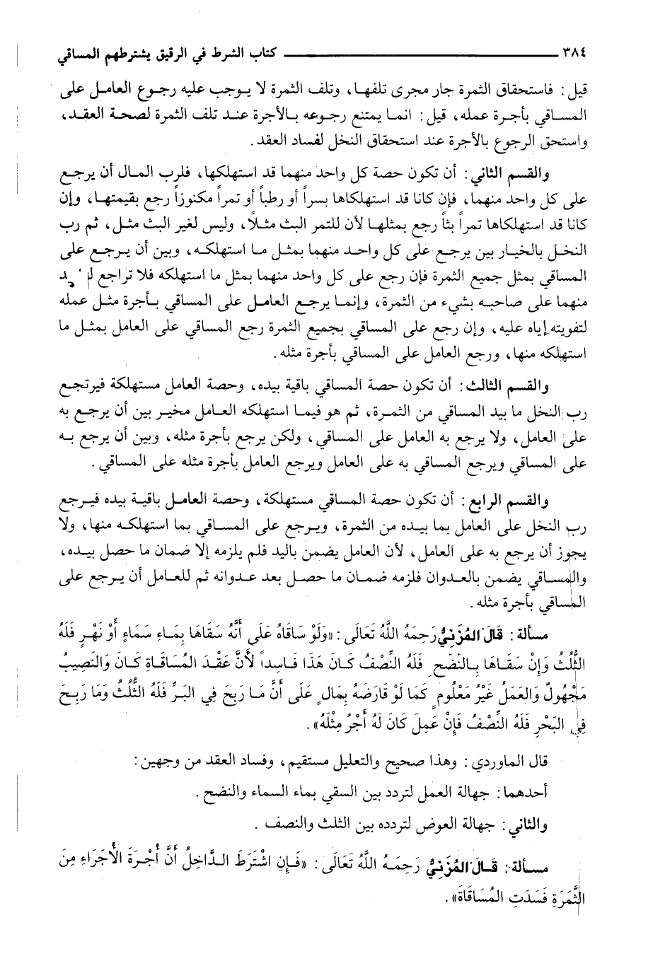 قال المزني رحمه الله تعالى: " وَلَوْ سَاقَاهُ عَلَى أَنَّهُ سَقَاهَا بِمَاءِ سماءٍ أَوْ نهرٍ فَلَهُ الثُّلُثُ وَإِنْ سَقَاهَا بِالنَّضْحِ فَلَهُ النِّصْفُ كَانَ هَذَا فَاسِدًا لِأَنَّ عَقْدَ الْمُسَاقَاةِ كَانَ وَالنَّصِيبُ مجهولٌ وَالْعَمَلُ غَيْرُ معلومٍ كَمَا لَوْ قَارَضَهُ بمالٍ عَلَى أَنَّ مَا رَبِحَ فِي الْبَرِّ فَلَهُ الثُّلُثُ وَمَا رَبِحَ فِي الْبَحْرِ فَلَهُ النِّصْفُ فَإِنْ عَمِلَ كَانَ لَهُ أَجْرُ مِثْلِهِ ".