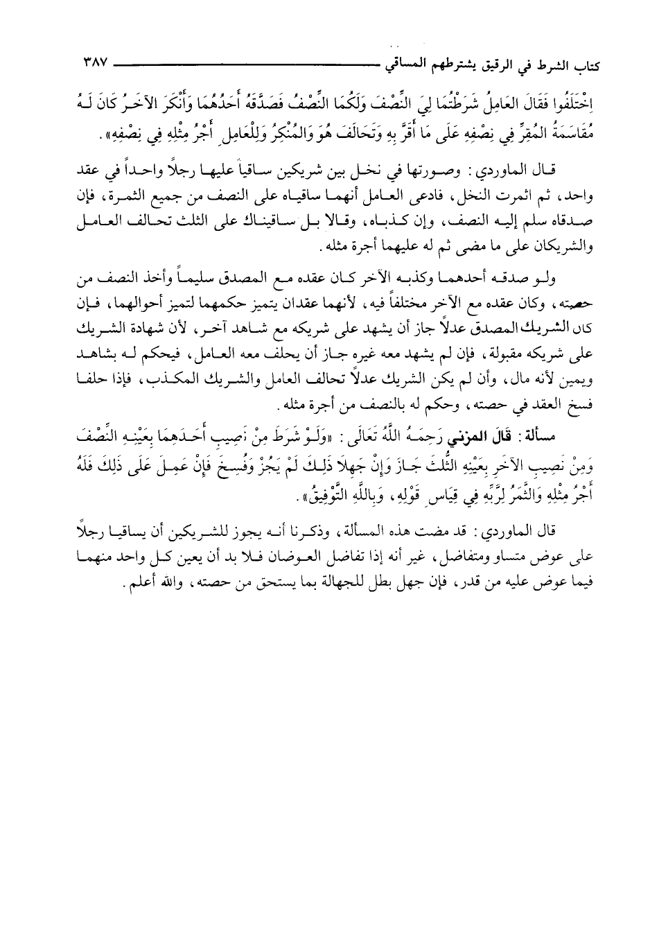 قَالَ الْمَاوَرْدِيُّ: قَدْ مَضَتْ هَذِهِ الْمَسْأَلَةُ، وَذَكَرْنَا أَنَّهُ يَجُوزُ لِلشَّرِيكَيْنِ أَنْ يُسَاقِيَا رَجُلًا عَلَى عِوَضٍ مُتَسَاوٍ وَمُتَفَاضِلٍ، غَيْرَ أَنَّهُ إِذَا تَفَاضَلَ الْعِوَضَانِ فَلَا بُدَّ أَنْ يُعَيِّنَ كُلُّ وَاحِدٍ مِنْهُمَا فِيمَا عَوَّضَ عَلَيْهِ مِنْ قَدْرٍ، فَإِنْ جُهِلَ بَطَلَ لِلْجَهَالَةِ بِمَا يَسْتَحِقُّ مِنْ حِصَّتِهِ، وَاللَّهُ أَعْلَمُ.